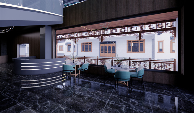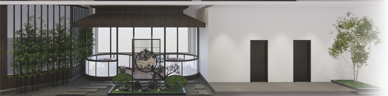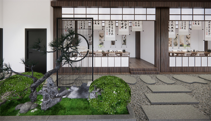 茶室的设计两点在于室外景观,将西大街建筑特点“人字形屋顶”叠级做景观设计。空间的功能分区主要有前台、茶水间、半开放茶室、亭台茶室、包间与微景观。空间层高为5米,在三米处放置楼板将空间隔起来,半开放茶室做亭子设计,顶部延伸至五米处,空间融入雕花窗的特色元素,打造一个古色古香的茶室。