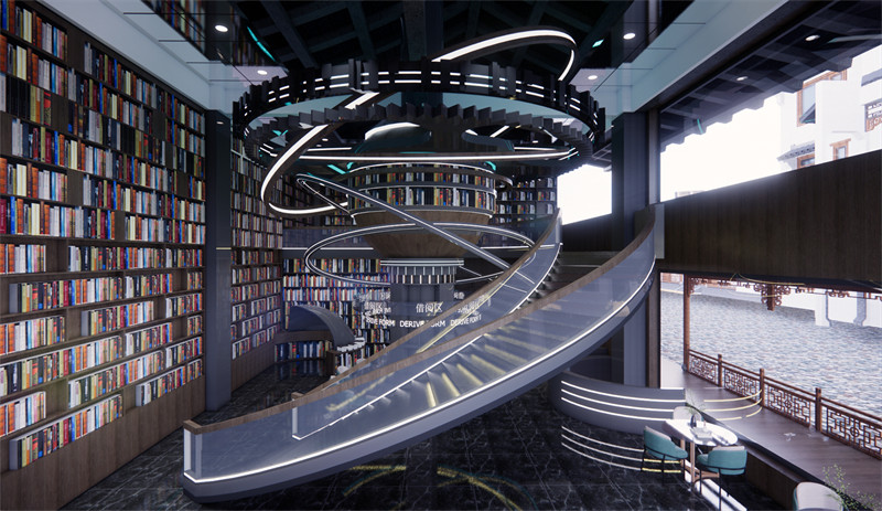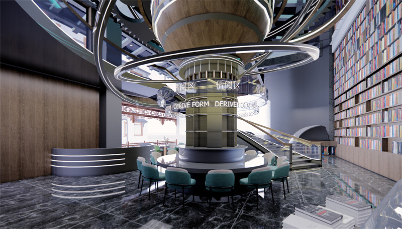 此项目的书屋占地400㎡,做二层设计。一层空间功能分区主要有休闲阅读区、前台、卫生间、咖啡休闲区、咖啡制作区、藏书阁、自习区、置物区与产品体验区,二层空间以藏书阁与阅读区为主。空间元素使用时间与齿轮,时间的含义为西大街从民国时期繁衍生息,经过时间的洗礼仍然将文化保留的如此完整,所以时间是印证历史的唯一证明。齿轮的含义为西大街将要重建,发展,在他建成开放的那一刻,命运的齿轮开始转动,所以齿轮是缺一不可的元素。