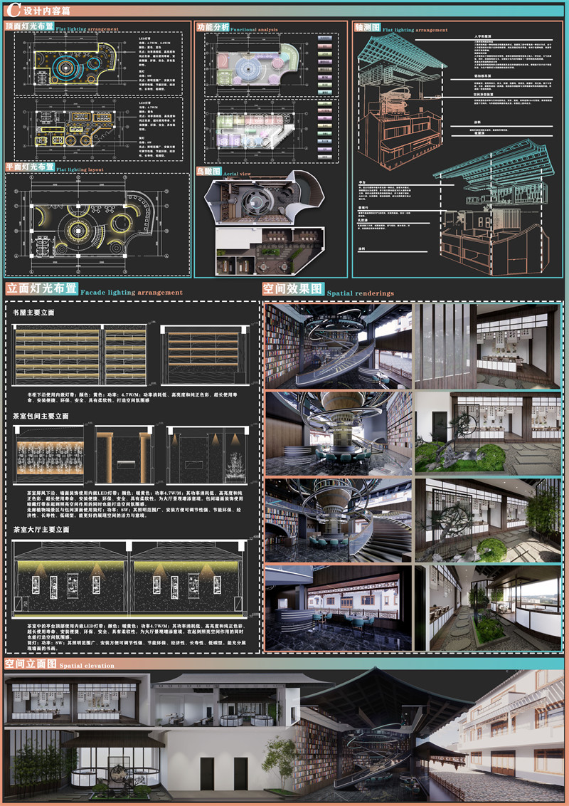 书屋与茶室外观采用木材与砖瓦,屋顶使用原始建筑材料,保留建筑原装。木材的使用总能给人意想不到的惊喜,在建筑顶部周边使用灯带能给建筑不一样的效果。书屋室内主要采用GRG石膏板,室内空间放置异形装置需用到grg石膏板,室内空间与外部风格做反差,形成视觉上的冲击力。空间色彩以砖瓦的黑灰色为主,稍加木质色彩提亮,加上灯光能达到不一样的效果。