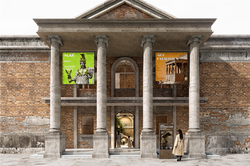 西侧为新建建筑,主要功能为艺术体验区与办公区。造型上采用双坡屋顶的变形,仿佛老礼堂建筑的延申,一层靠近中庭一侧设置公共属性较强的空间如咖啡厅、洽谈角等作为活跃室外空间的过渡,西侧作为艺术体验用房,根据不同主题的展陈学习不同的画作、手工制作。当游览者通过观赏的方式了解古希腊历史之后,还可在此亲身操作、参与雕塑的制作,绘画的临摹,沉浸式感受展陈时期的艺术风格。