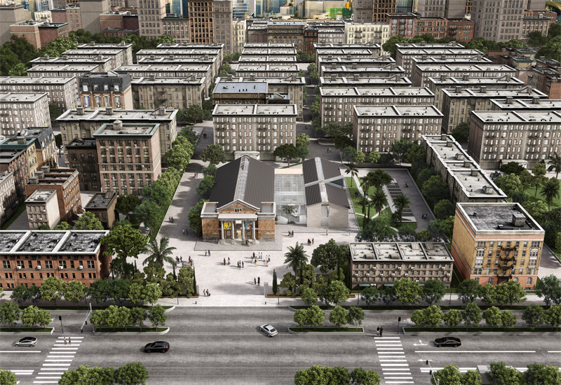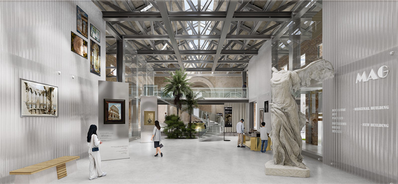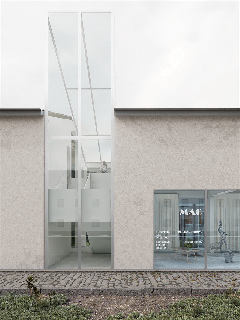 设计整体延续正交体系,右侧空间置入新体量,中部采用透明中庭相连,作为新老建筑之间的过渡。主体建筑礼堂内部作为展厅,可根据不同展览主题进行灵活布展。