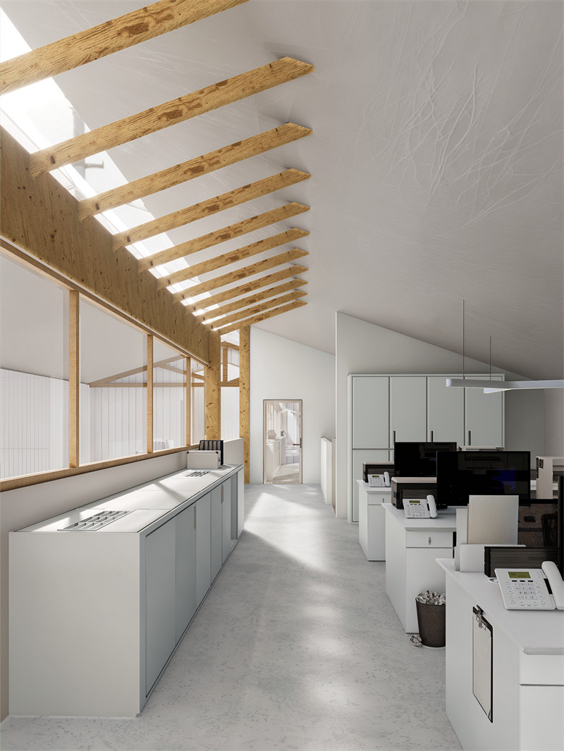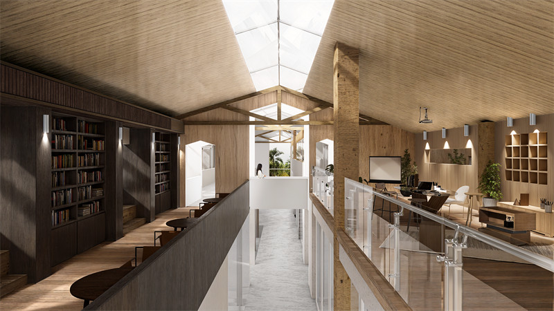 二层设置私密性较高的办公区域,东侧的图书长廊对外开放,在二层较为清净的角落为使用者提供阅读书籍的场所,东侧更多的置入艺术家工作室、办公用房和会议室,产业复合且功能齐全。