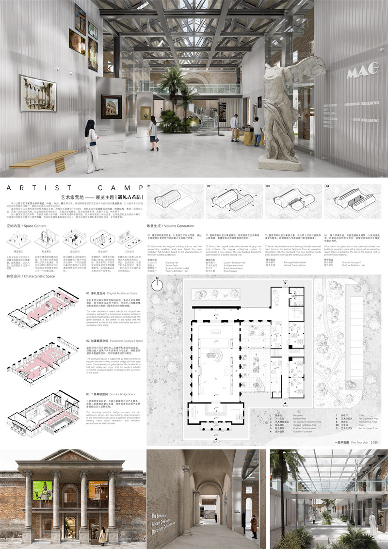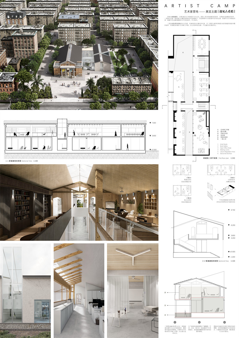 设计主题为艺术家营地兼具展览、体验、办公、餐饮等功能,根据既有建筑的现实条件对空间进行置换更新,以功能诉求为前提对空间的发展予以研讨,更新活化场地以及周边空间。