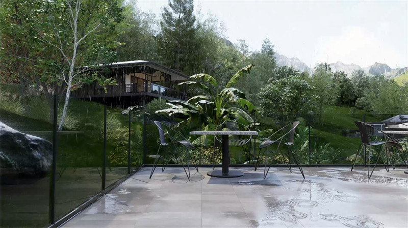 本设计的主体山地民宿,位于一处风景秀丽的山地之中,四周被茂密的森林和连绵的山脉所环绕,自然环境得天独厚。民宿选址充分考虑了景观资源的最大化利用,背靠高山,主要景观面有多个方向,视野开阔,景色宜人。场地内地形复杂多变,地势高差较大,这既为民宿设计带来了挑战,也提供了丰富的景观层次。因为民宿周边自然环境优美,山水相依,拥有丰富的自然景观资源的同时,周边已有的建筑对设计民宿也存在一定的视线影响,因此我们在设计时充分考虑建筑布局与周边环境的协调性和隐私性保护。我们通过合理的建筑布局和景观设计,实现了建筑与自然的和谐共生。