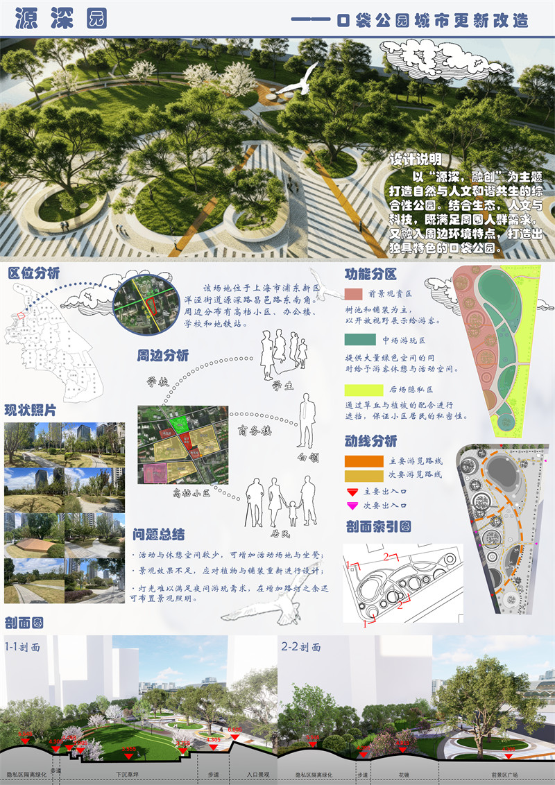 项目规模:本次改造场地约3400平,形似梯形,位于源深路边,场地内绿化面积较大,且几乎无游乐设施与健身器材及休憩场所。