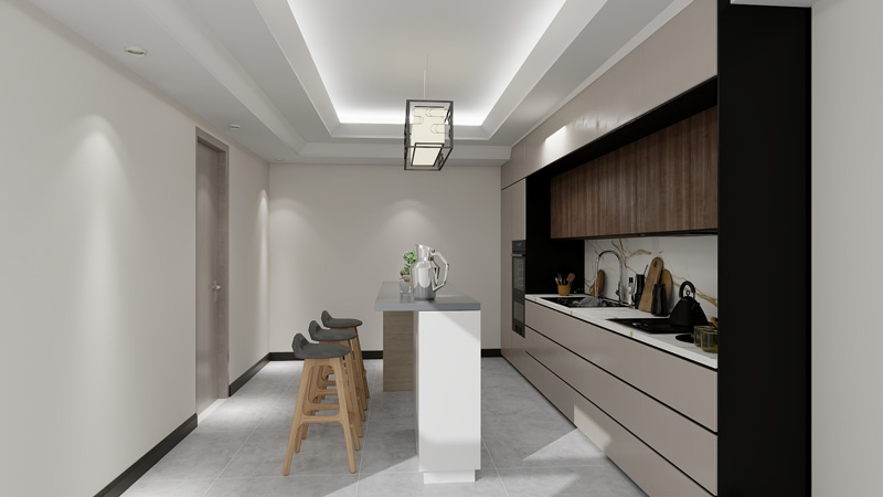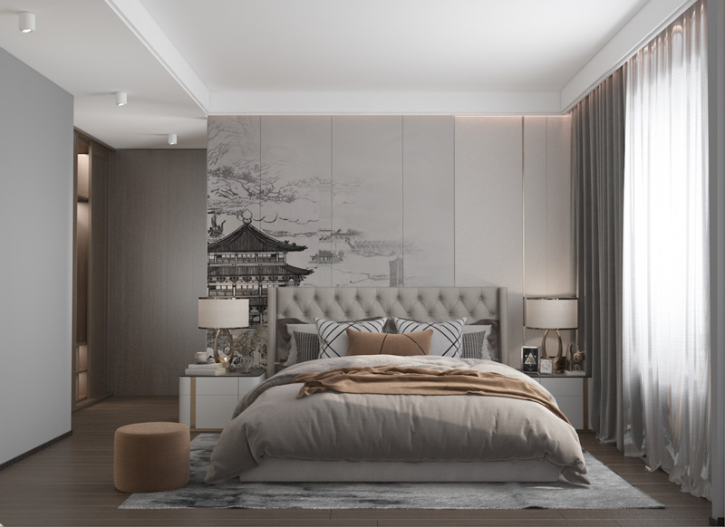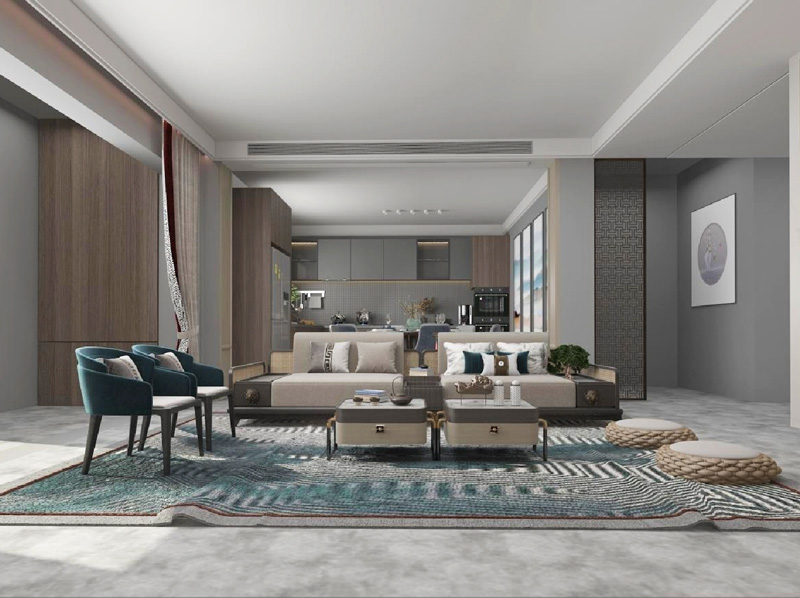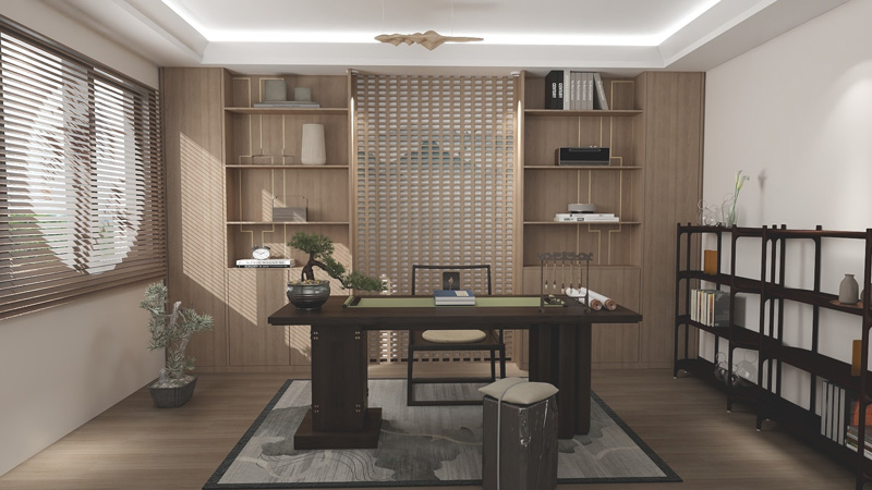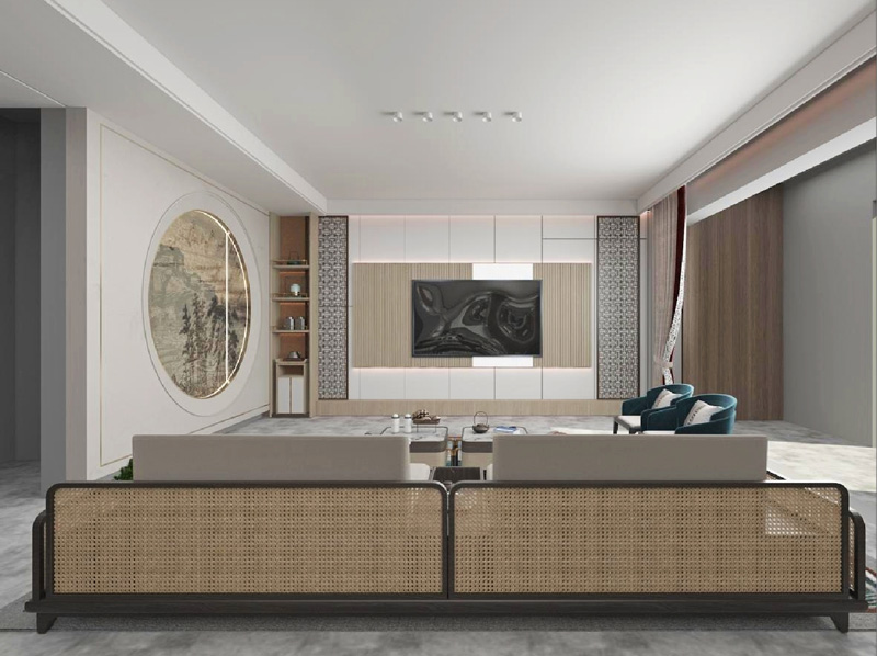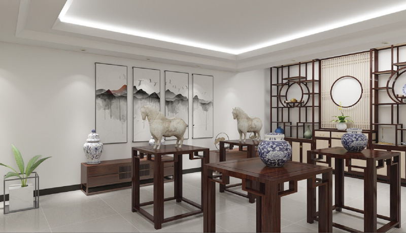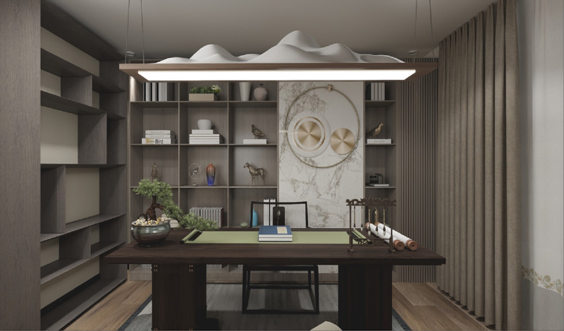 本案在设计手法上,突出了文化人温文尔雅、平和理性的特点,客厅用浅黄色的整体色调,表达业主的温馨典雅。在设计风格定位上,吸取了新中式的一些经典元素,既不过分张扬,而又恰到好处地把古典高雅之气渗透到每个角落,又适当彰显业主的个人品味。还额外添加了展厅,展厅的设计也尽现典雅之气,展厅与电梯间之间用木雕镂空的屏风隔开,古朴自然。笔绘区有门洞方便业主绘画,茶室与笔绘区连接,享受生活,很是惬意。