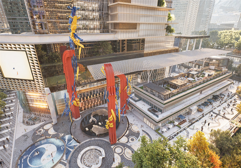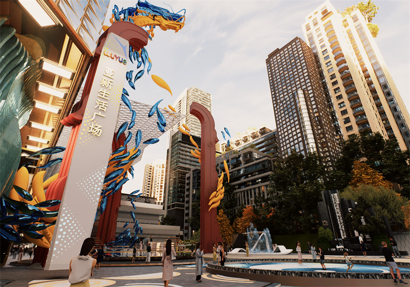 文化元素:在设计中融入了锦鲤文化,锦鲤不仅在中国传统文化中象征着好运和长寿,也与广场的“亚新”二字相呼应,寓意着广场的新生和繁荣。