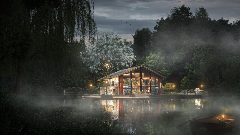 建筑采用三面全落地玻璃窗与木结构结合的形式,使室内外空间界限被弱化。落地玻璃最大化引入自然光线和景观视野,让室内空间与周边绿地融为一体,提供沉浸式的自然体验,同时木结构带来温暖且富有质感的氛围,强化建筑与自然的对话关系。