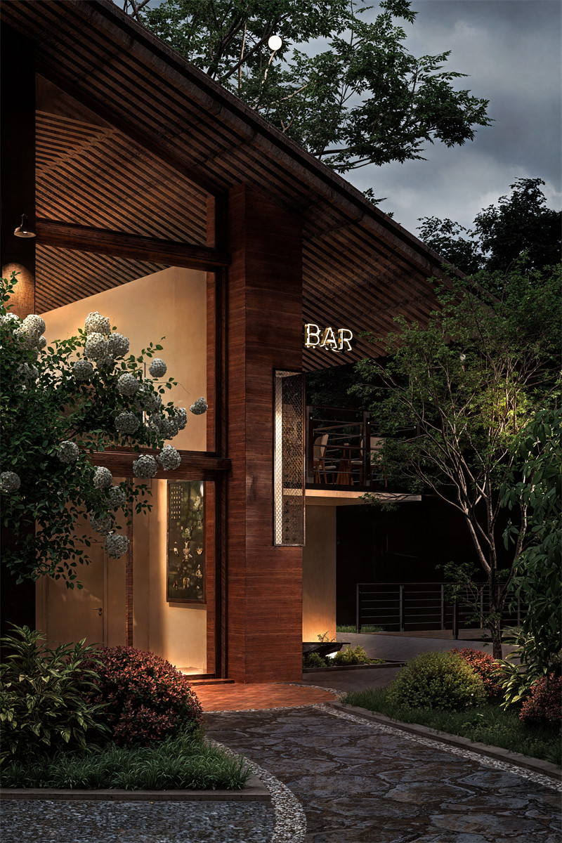 二楼阳台通过悬挑设计提供观景平台,同时作为树冠延展的交互节点,为游客带来独特的视觉与自然体验。