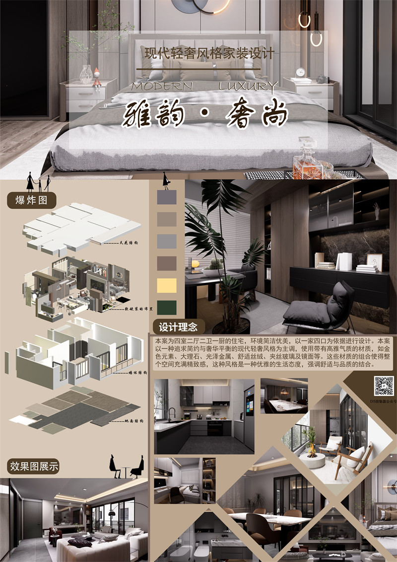 我们所设计的方案融合了现代简约风与奢华的质感轻奢风格,以精致优雅的姿态,诠释着对高品质生活的追求,为居住者营造出了一个既舒适自在又充满艺术气息与尊贵感的空间环境。