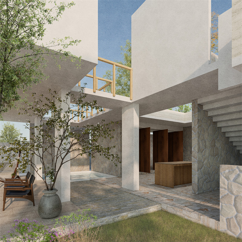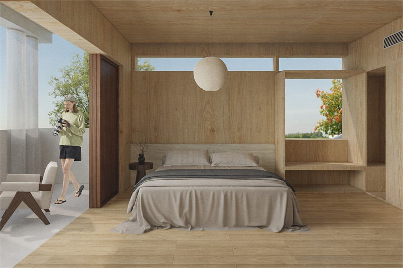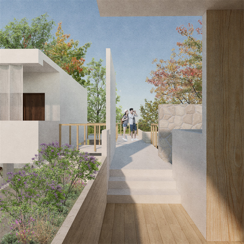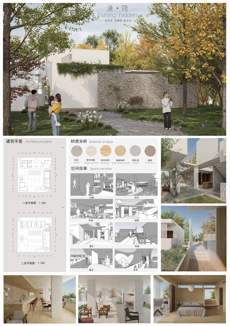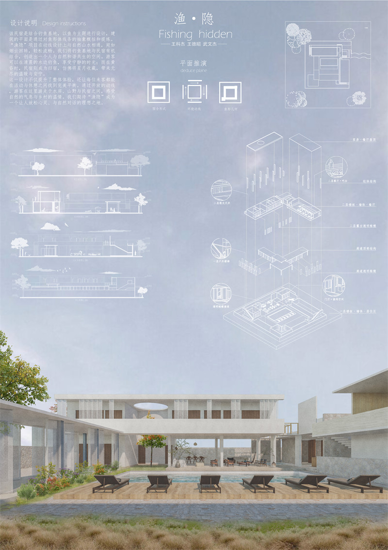 该建筑方案设想的核心是打造一个不仅吸引外来游客,还能让当地人民参与进来的休闲场所。为此,我们设计了一种将娱乐性与实用性完美结合的方案——渔隐。它是一个以钓鱼为主体的休闲基地,同时也是一个能提供给当地人和年轻人共同体验的民宿综合体。