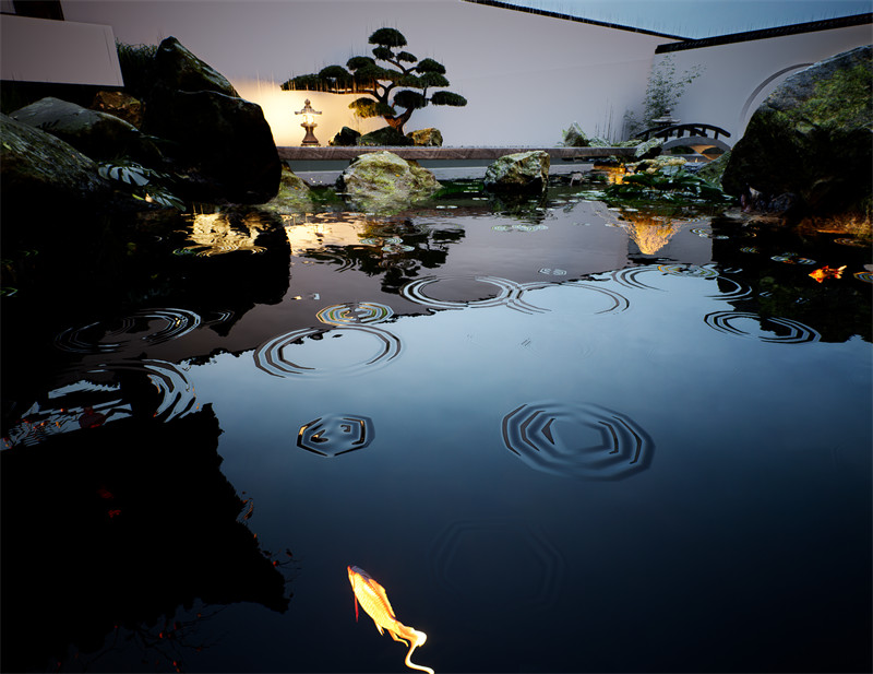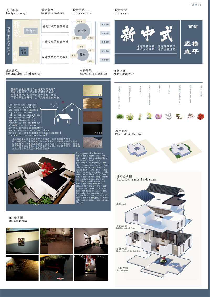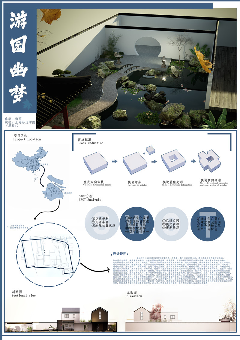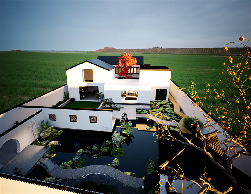 基地位于上海市浦东新区张江镇环东村桥弄里,属于江南美丽乡村,设计风格上采用新中式风格,结合现代宅寂风,摒弃繁杂的装饰,注重空间的合理变换,合理分配,从闭合到开场到闭合再到开敞,有起承转合的古诗韵味,达成体验感十足的效果。从入口到建筑,通过一系列的新中式园林风格的体验,通过山水隐喻,结合场地的空间变换。主入口进来,通过一道传统月洞门景墙的设置,既作为空间的一道障景,营造先抑后扬的氛围,同时也通过月洞门透出的远景为引导,勾起进入场地的欲望,穿过月洞门,豁然开朗,便进入建筑主庭院,是一片较为开阔的水景,精致的小桥,护路的自然假山石,勾勒出一道新江南水乡的场景。走到亭子处,小憩片刻,感受一下屋主在繁忙之余在此回归心灵的体验,看看池塘中的莲叶荷花,欣赏一下角落的雨打芭蕉场景,感受一下“居有竹”的雅致,看着水中的锦鲤悠然自得,仿佛在此生活了好多年,让你忍不住想到陶渊明追求的诗酒田园式生活。走到主建筑入口,有一道和廊相连的平台,若三五好友前来时,便可以在此倾谈,品茶,棋牌。当池塘升起薄雾,对面的老树在亭子的衬托下产生了一种迷离感,大家自然而然荡气回肠起来。进入居室内,小天井让你有一种回归的凝聚感,便捷到达各种不同的房间,房里不同的摆设都展示了房主对生活的喜爱和追求。沿主建筑四周有一道蜿蜒曲折的小道,这里空间相对闭合,但也最终通过开闭的空间不断不换而回到主入口,形成完整的闭环。通过对基地设计旨在打造一个传统文化与现代表现相统一,和谐,自然舒适且功能齐全的居住与环境统一整体感十足的空间,既满足现代家庭的多样化需求,又能保有经典之风的江南古典美的设计和布置,同时考虑了室外环境的更多的使用,在心灵上更契合房主的追求,提升居住者的生活品质和幸福感。