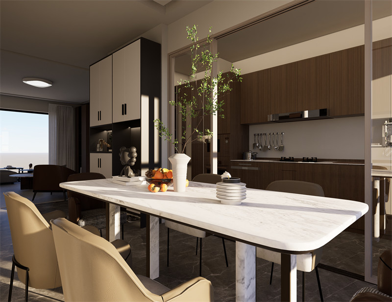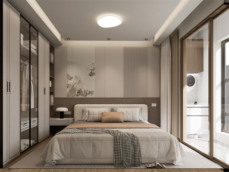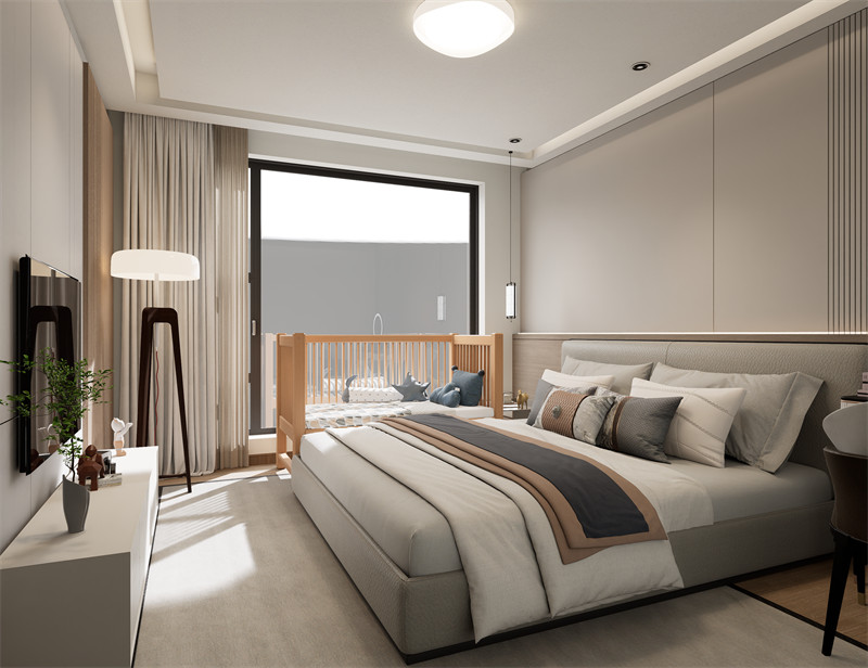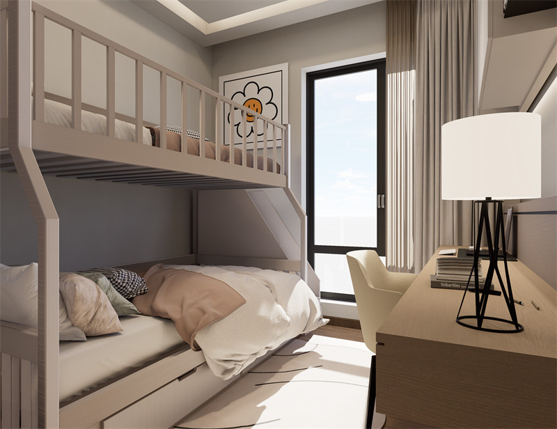 本设计服务的对象为一家四口,男女主与两个年幼的女孩,老人偶尔来住。以木质元素为空间基调,大理石元素为辅,建立现代简约的造型,营造出柔和的氛围。客厅、餐厅和厨房采用半开放式设计,减少阻断,增加空间互动性。搭配灰色沙发和木制茶几,简洁而不失温馨。通过大落地窗引入自然光,同时使用隐藏灯带和射灯营造夜晚的温馨氛围。玄关处储物柜和换鞋凳结合使用,使入户和客厅区域更加宽敞明亮。衣帽间安置于主卧,主卧剩余空间放置婴儿床与梳妆台。床头采用软包靠背床屏设计,是卧室空间感扩大。整体以色调雨材质的交叠而内容丰富。儿童房采用上下床,放置书桌书架一体式,增加了储物空间。次卧可供老人来时居住,设有衣服晾晒区,并放置洗衣机。