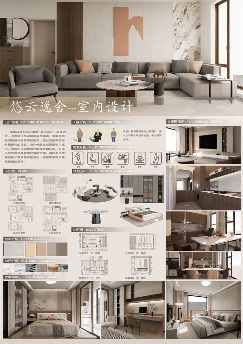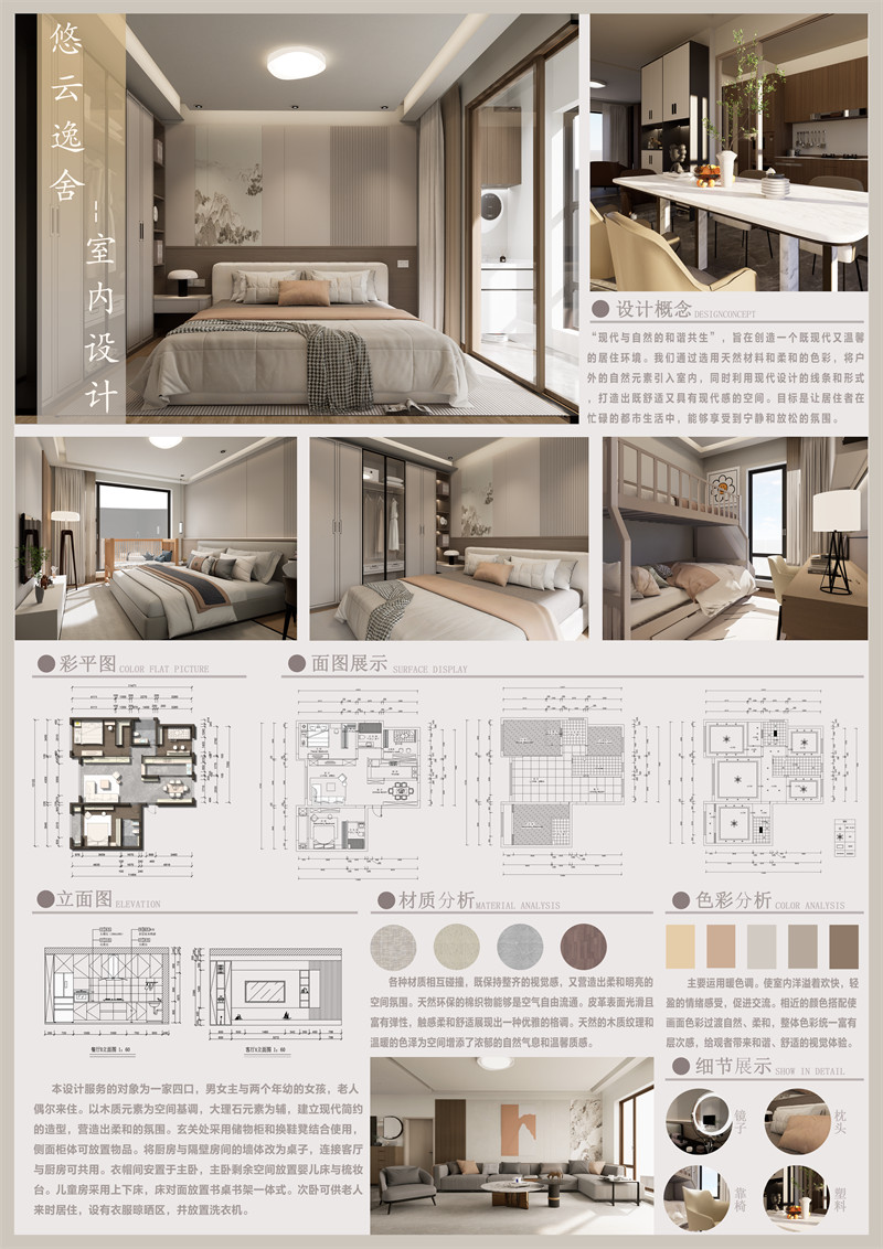 本项目名为悠云逸舍-室内设计。旨在创造一个既现代又温馨的居住环境。首要原则是满足居住者的功能需求。通过选用天然材料和柔和的色彩,将户外的自然元素引入室内,同时利用现代设计的线条和形式,打造出既舒适又具有现代感的空间。目标是让居住者在忙碌的都市生活中,能够享受到宁静和放松的氛围。