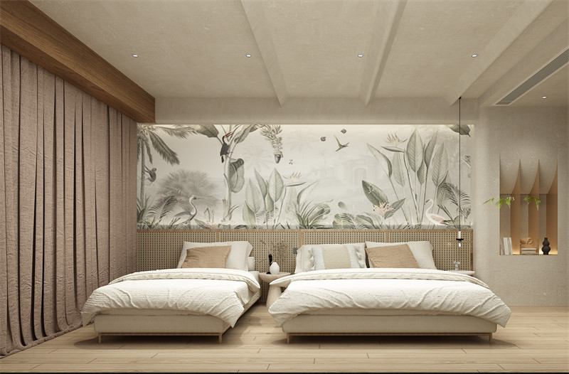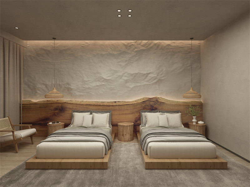 走进民宿内部,一股温馨的气息扑面而来。空间布局上,设计师巧妙地利用原有房屋结构,将每个房间都打造得既私密又通透。房间内部装饰简洁大方,以白色和米色为主色调,搭配原木色的家具和软装,营造出一种自然舒适的氛围。床品选用高品质面料,柔软亲肤,让人在乡间的夜晚也能享受到五星级的睡眠体验。