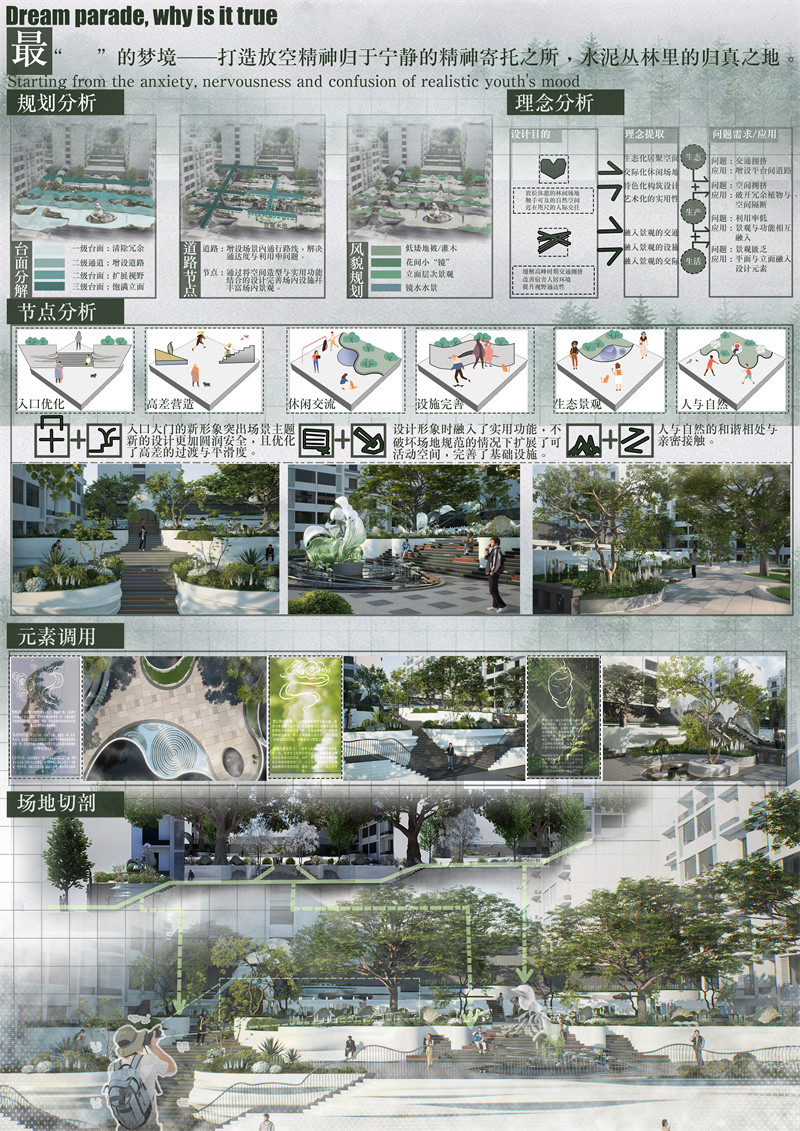 迷梦游行,何以为真。从现实青年心绪里焦躁,紧张,迷茫,幽闭的反思出发。打造放空精神归于宁静的精神寄托之所,水泥丛林里的归真之地。一:入 迷梦之中 弗洛伊德认为,体验是一种瞬间的幻想,也是对现在的感受。梦的概念与形式各不相同,场地营造以入场者的自我思考为主抛弃过多的修饰语言与解释以纯粹的色彩和构筑给入场者充分的自我遐想。二:寻 心中真物 勾勒空间的破碎支离与穿插感,对空间的结构的光色装置补充每一处光影营造一处梦境,模糊现实与理想的边界,让入场者心灵最本真的情感主导行为。三:沉 喧嚣静止 自然是每一种生灵内心深处渴求接近的地方,自然的恩泽漂浮于阳光空气中,萦绕在雨露雾气里。通过贴近自然构建朴质本真的心灵场所。四:归 返回现实 我们入梦然后沉眠,在梦中流连然后走出梦境。并被梦境影响着生活进程。构建流程式梦境体验。
