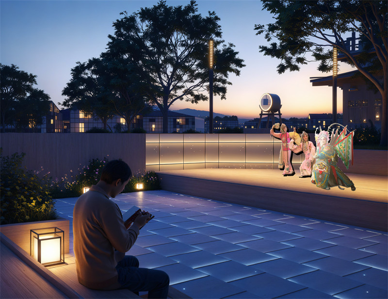 重现过往生活:当地过往生活以运动,娱乐,餐饮,戏曲为四个主要活动板块,该地老人常在场地内运动,下棋和跑步等活动,同时中午也有当地特色的餐饮提供服务,看书喝茶为当地下午的主要娱乐方式,日暮之时,也会有独特的京剧表演。因此我们以这四个板块为题,以时间为线索,以水流为流线,从晨钟的响起到暮鼓的闭幕,将场地划分成日晨运动,日中饱腹,日仄娱乐,日暮赏戏这四个区域,并将过往的活动设置在分区内,以此做到重现人们的生活。