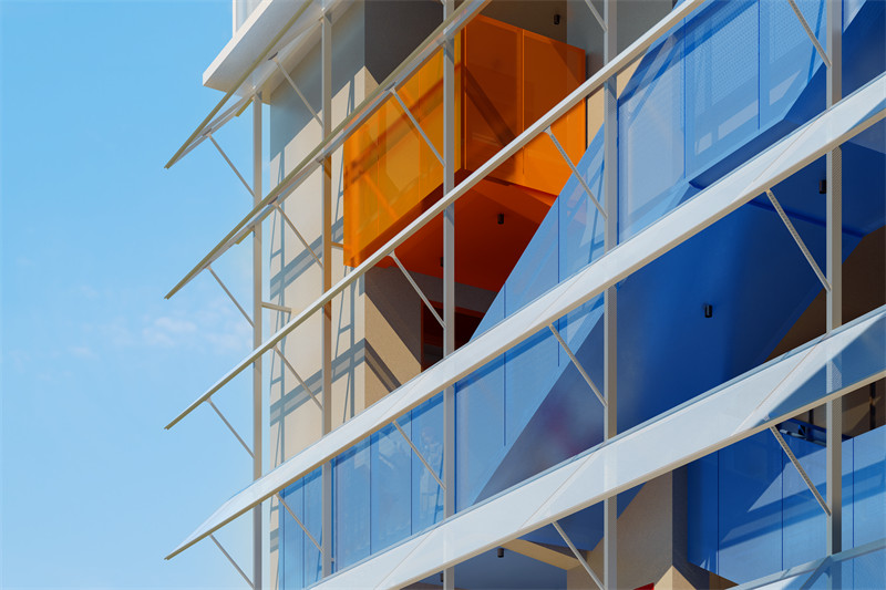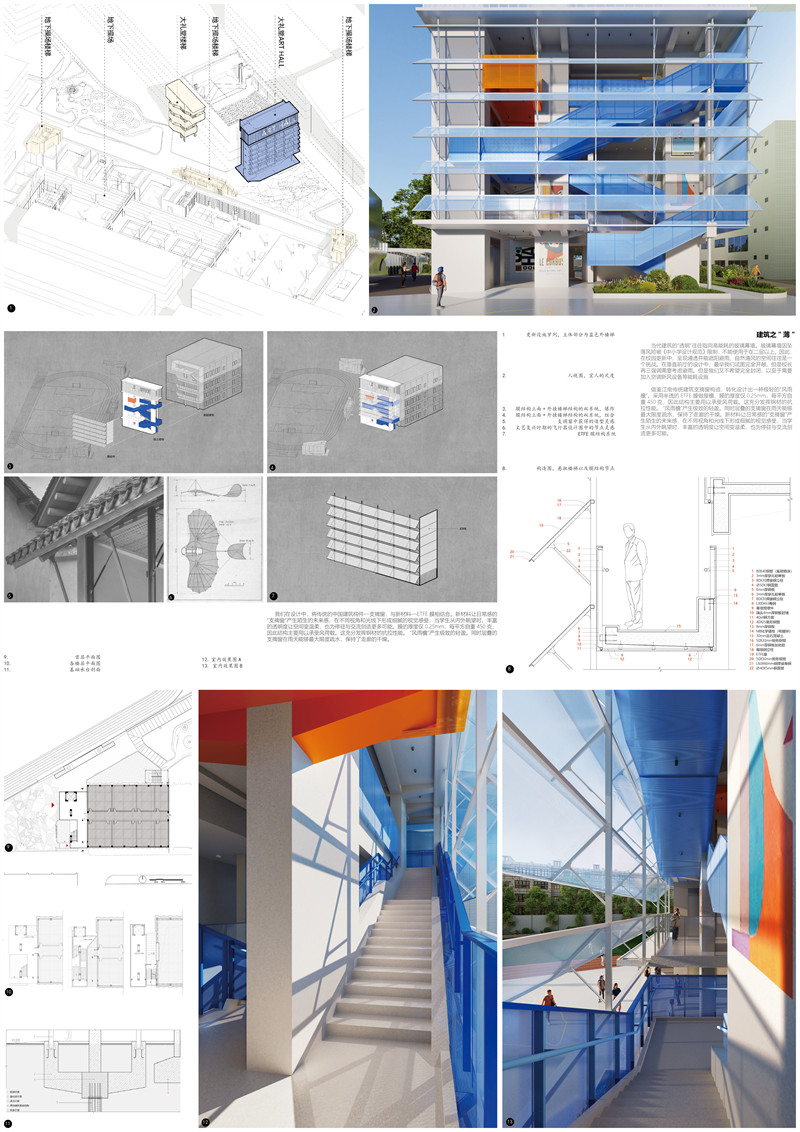 在当代建筑设计中,玻璃幕墙是“透明性”的代表,但其高能耗属性和坠落风险限制了在中小学场景中的应用,特别是在二层以上区域。因此,为了实现兼具通透性、遮阳避雨功能和自然通风的设计目标,我们在实验楼西侧设计了一个“垂直前厅”,希望通过材质创新解决这些难题。
