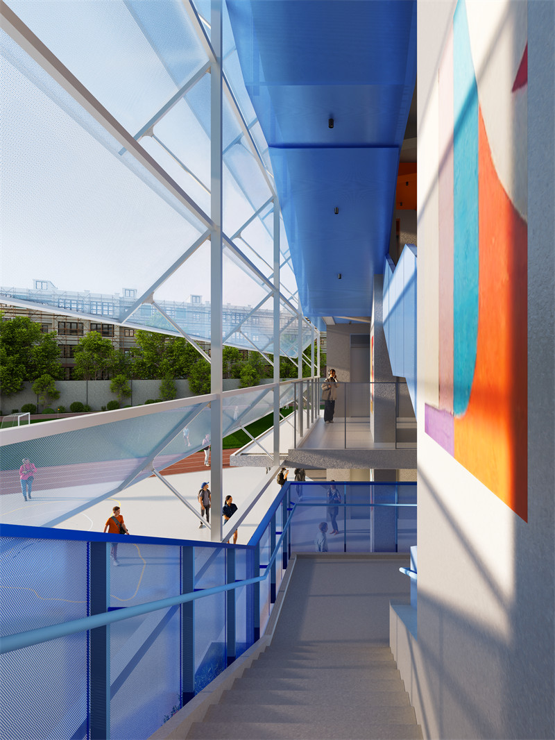 在更新过程中,我们注重细节的自然融入,使改造过程如润物细无声般地促进校园的有机生长。比如,在设计教学楼周边的灰空间时,加入适度的遮阳设施,为学生提供更多停留和社交的可能;地下操场的优化则通过改善通风采光条件,提升其使用体验;风井设施则整合了功能性与美观性,成为校园环境的一部分。