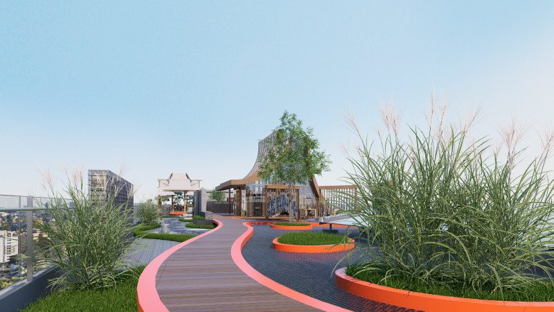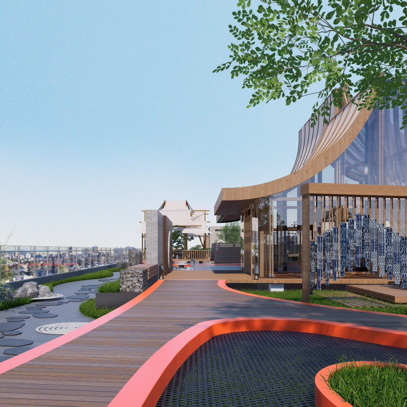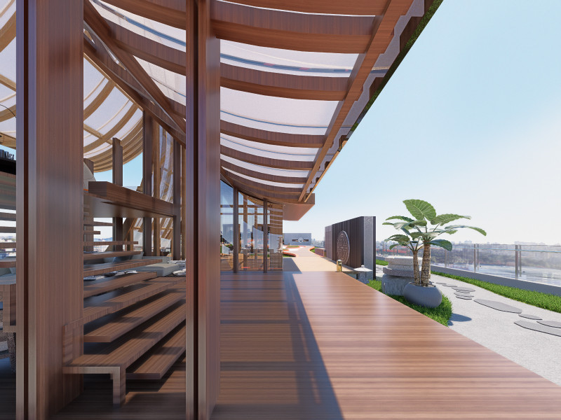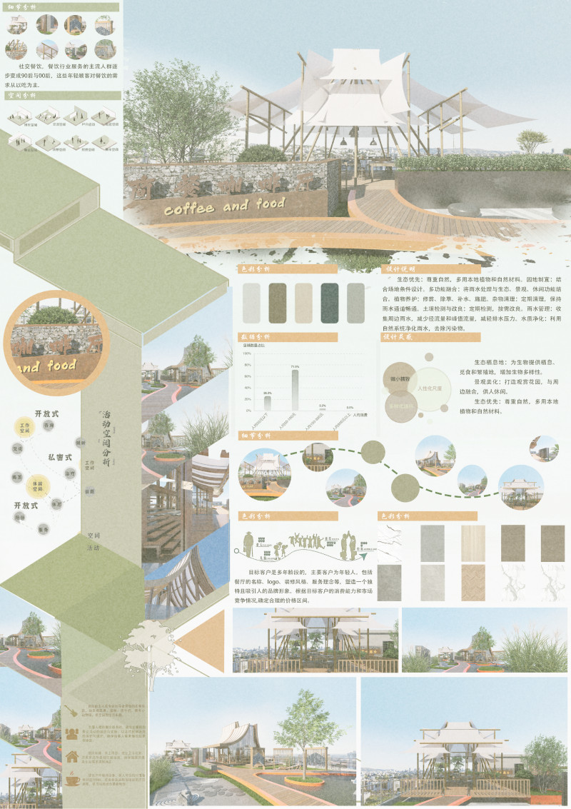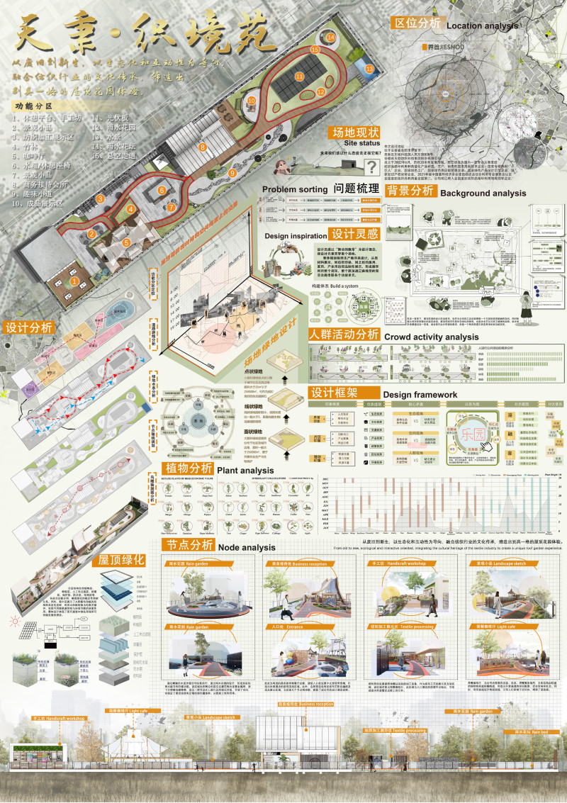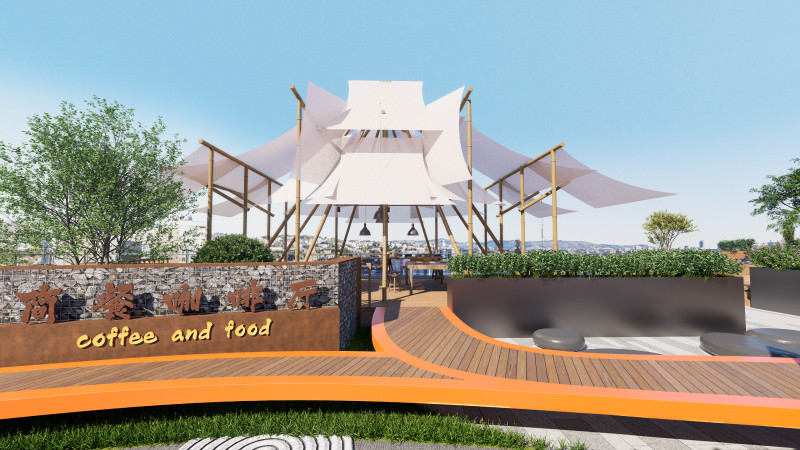 6.背景分析:安徽省天助纺织科技集团股份有限公司成立于2002年6月,历经20余年发展历程,现已经成为国内一家专业从事度旧方织品循环利用和高值化产品研发、生产、销售的国家高新技术企业、国家专精特新“小人”企业、国家绿色工厂、国家绿色供应链管理企业、国家绿色产品设计示范企业、国家知识产权优势企业。2021年被中国循环经济协会废旧纺织品综合利用专业委员会认定全国度旧纺织品利用量全国第二,公司现已跨入全国废旧纺织品循环利用领域领军企业。在这一背景下,屋顶花园的设计应运而生,旨在为公司员工及访客提供一个与自然亲密接触的空间,显公司对环保理念的坚定承诺。屋顶花园不仅是生态绿化的体现,也是企业文化与员工健康的延伸。设计团队希望通过这一项目,结合现代办公环境的需求,创造一个既具美感又具实用性的多功能空间。