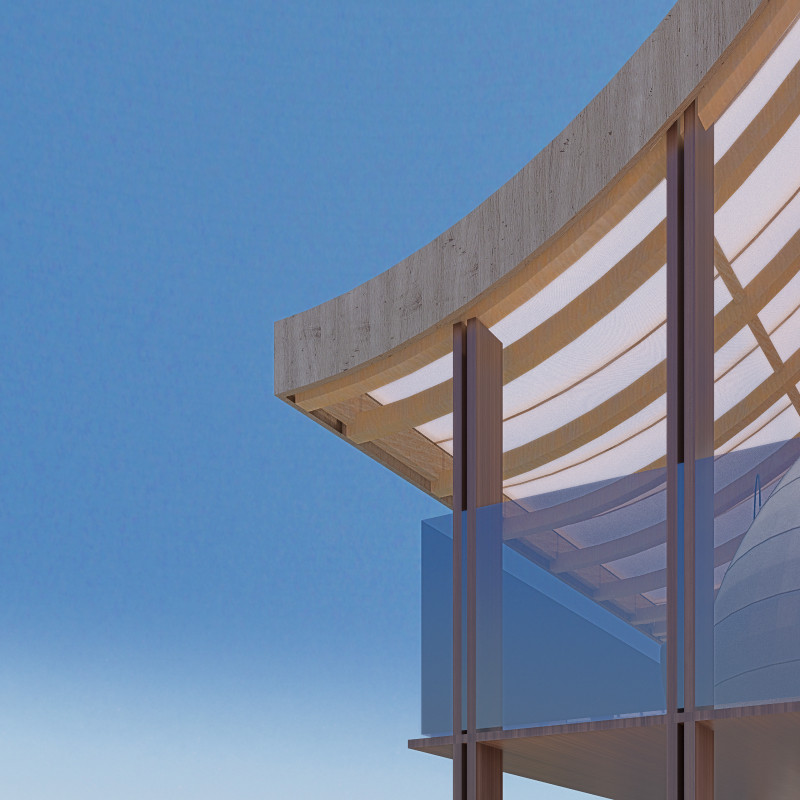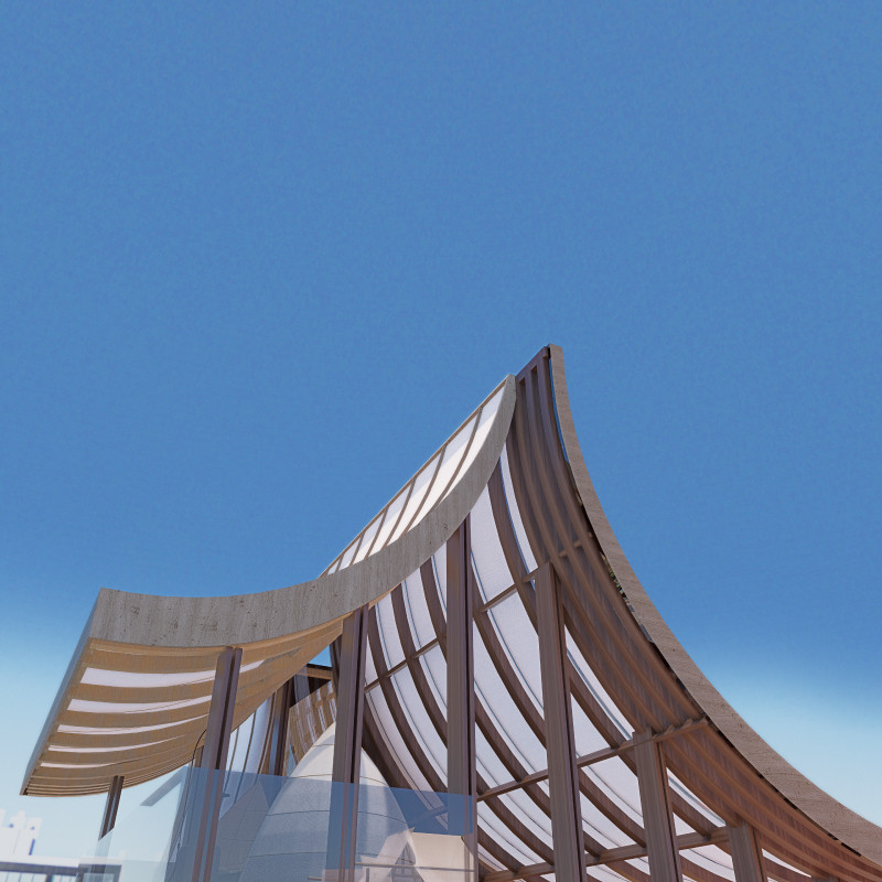 3.设计理念及思路:设计灵感以“舞动的飘带为设计理念将设计元素贯穿整个场地。思路是整体规划按照生产顺序来设计,从原材料展示,到纺织印染、到之后的服用、家用、产业用纺织品制作展示,形成循环利用整个闭环。整个屋顶通过曲线型的架空走廊串联各个功能单元。