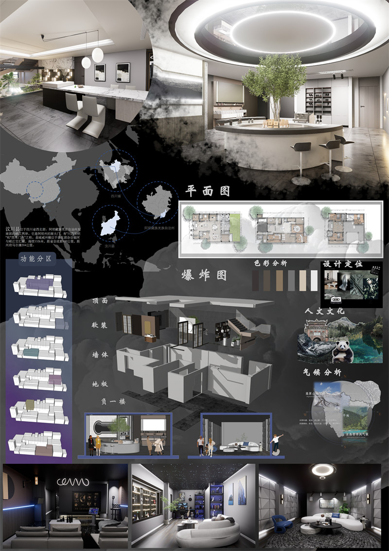 整体地下空间方便私人活动满足发展自己的兴趣爱好。一楼则是增加家庭社交有更多便利性和实用性电子火炉可以创造浪漫氛围装饰和美化空间提供温暖和舒适的氛围营造。书房可以进行创作和艺术活动让人更加专注。安静的环境保持良好的思绪。整体设计色调偏暖灰黑色也是警醒的告诉人们存于梦境的家也是可以寄存一丝活力与温暖。