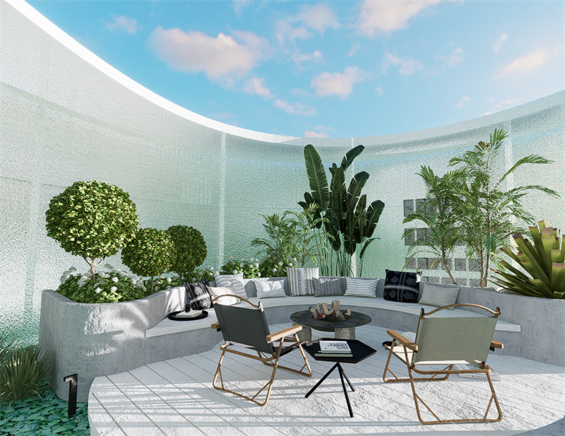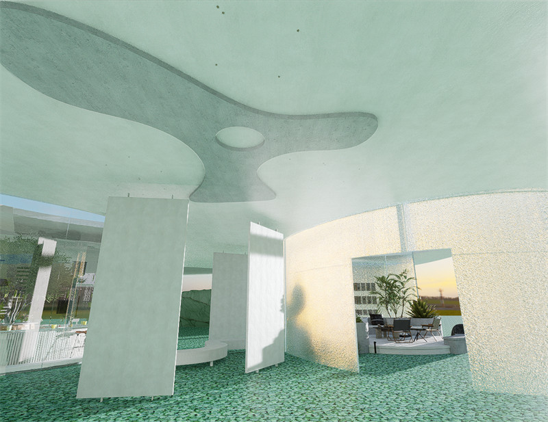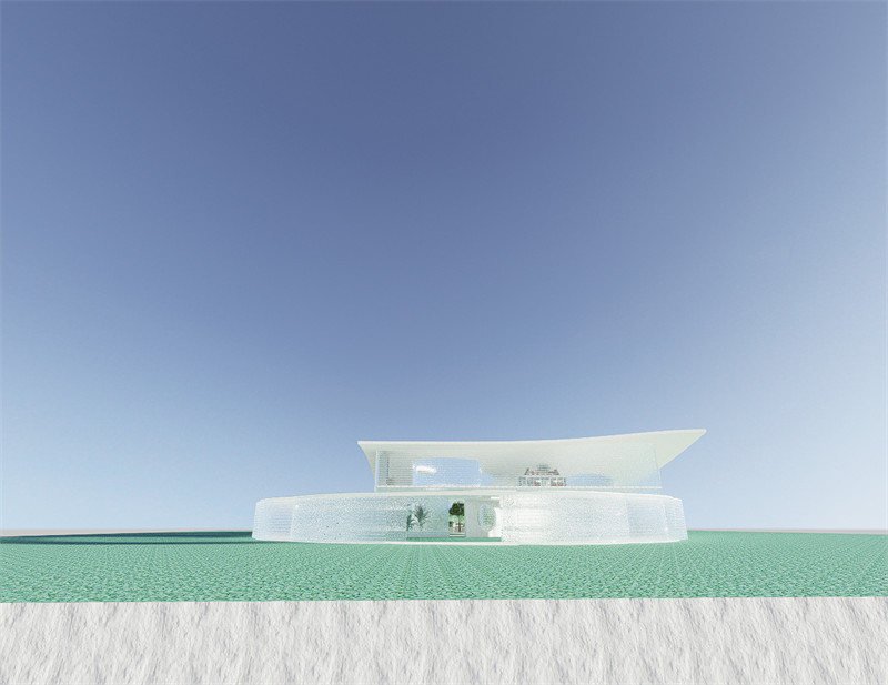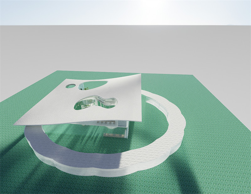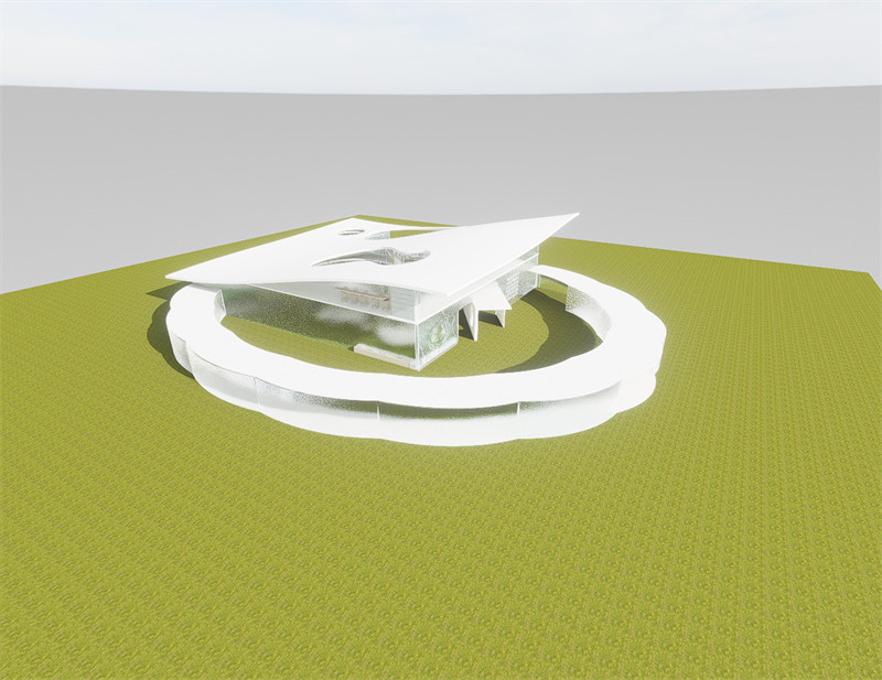 在精神提取方面,白花蛇草水源于自然的草本植物,蕴含着自然、纯净与健康的精神内涵。“之山折水” 的设计主题应运而生,将自然元素进行抽象与重构。以气泡形态构建主体建筑,不仅呼应了饮品的气泡感,更象征着自然的灵动与活力。建筑内部空间开放互通,如同山间的清风自由穿梭,模糊了室内外的界限,将室外的绿色景观引入室内,极大地拓展了人居环境中的绿色空间。在建筑周边与内部,精心布置各种药草植物与摇曳的草丛,营造出闲庭信步的惬意氛围,让消费者仿佛置身于山脚下的宁静庭院,远离都市喧嚣,沉浸于品牌所倡导的自然健康的生活情境之中。