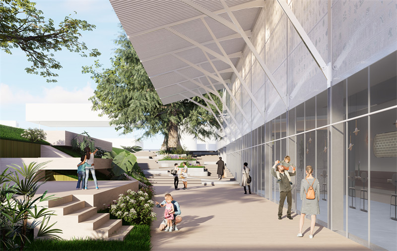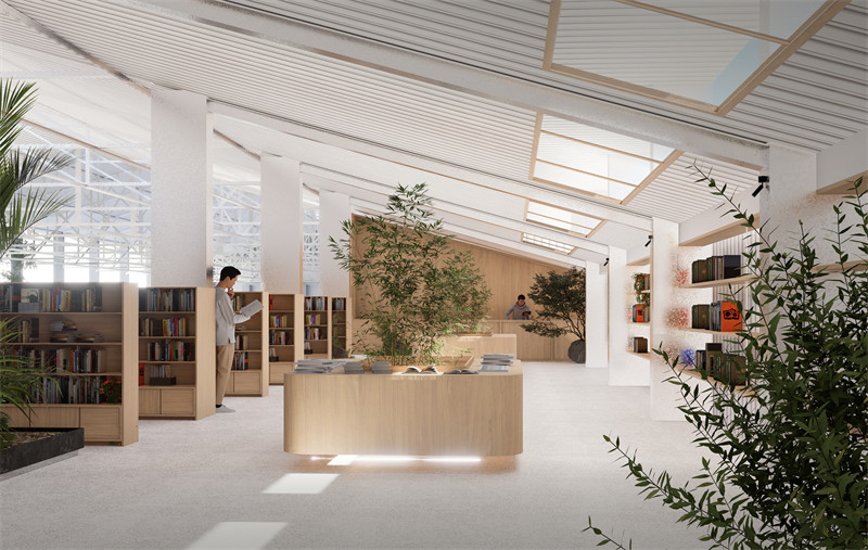走过柱阵大厅来到西部的小厂房,室内原有的二层厂房结构被轻柔地消解成一道连续上升的螺旋坡道,串联起植物馆配套的商业、餐饮和自然书店。工厂两侧原有的波纹钢板被尽可能移去,以通透的玻璃界面和自由流畅的弧形雨棚塑造更加开放的室内外过渡空间,改善工厂昏暗光环境的同时和外部商业生态积极联通,成为价值工厂再一次拥抱游客的窗口。