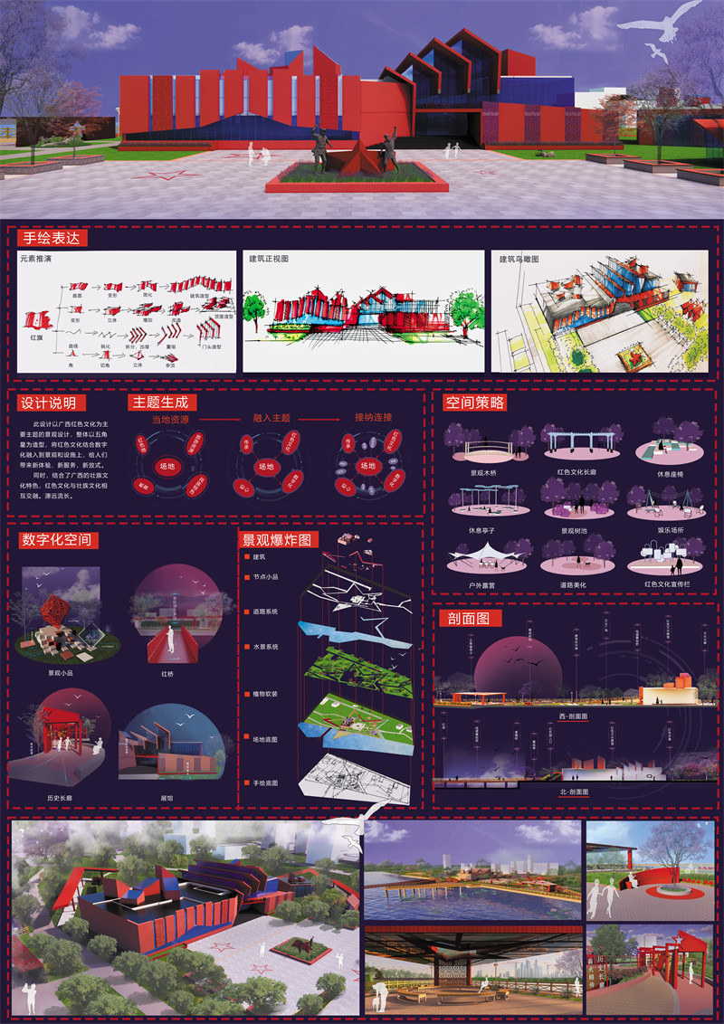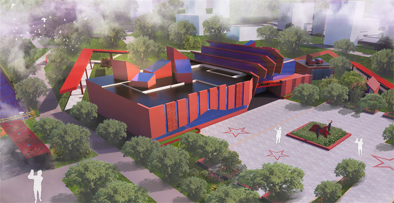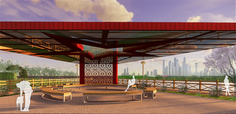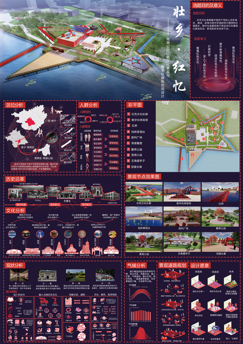 此景观设计以广西红色文化为核心主题,整体造型采用五角星,把红色文化与数字化元素相结合,并融入到景观及设施之中,从而为人们带来全新的体验与服务方式。该设计还融合了广西壮族文化特色,使红色文化和壮族文化相互渗透、相得益彰,这种融合使文化内涵源远流长。