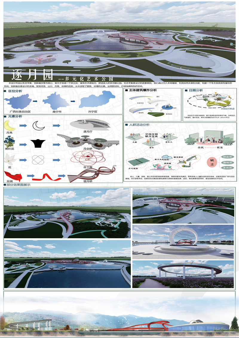 逐月园是一个充满创意与艺术氛围的多元化艺术公园设计项目,它融合了多种元素,旨在为游客创造一个集自然景观、文化体验和艺术欣赏于一体的综合性公共空间。