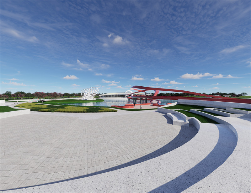 从设计效果图来看,公园的建筑和景观造型极具现代感和艺术感。建筑的形态流畅自然,多采用曲线和圆形的设计元素,给人一种柔和、和谐的视觉感受。色彩上以白色和绿色为主,白色的建筑在蓝天绿树的映衬下显得格外醒目,绿色的植被则为整个公园增添了生机与活力。