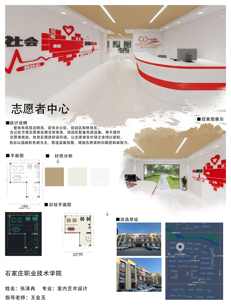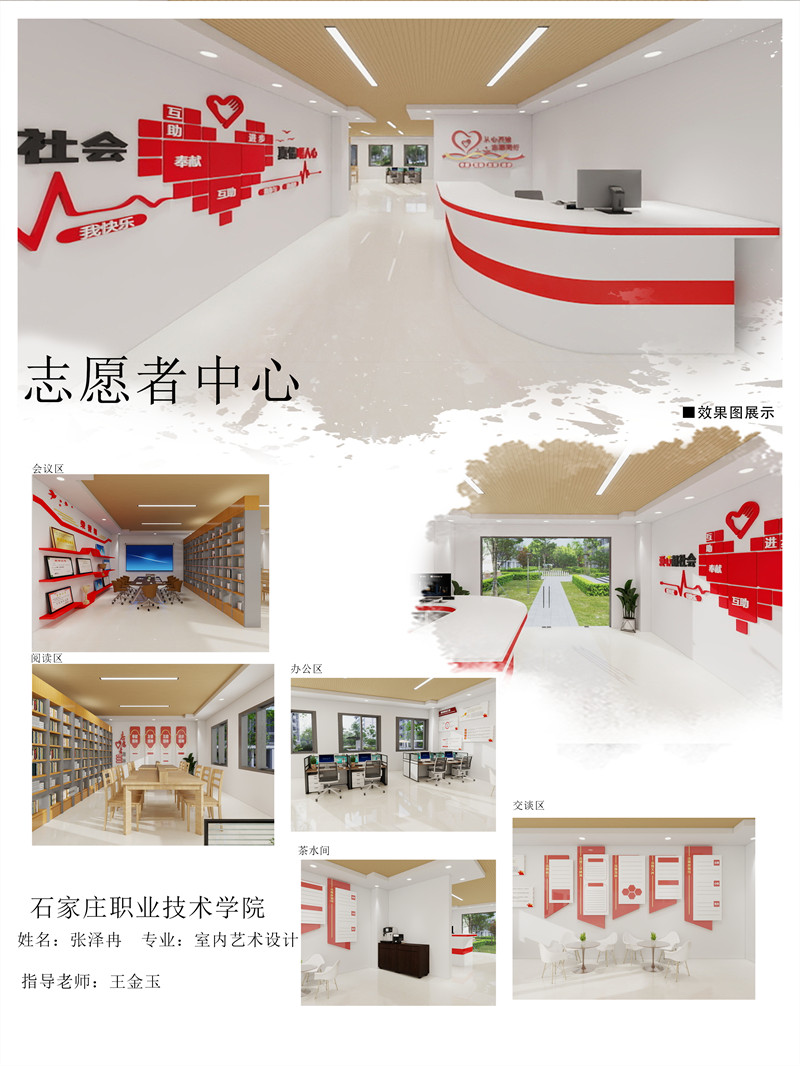 本设计以“奉献、友爱、互助、进步”的志愿者精神为核心,旨在打造一个温馨、舒适、高效的空间,为志愿者们提供良好的工作和交流环境。设计充分考虑了志愿者的需求和活动特点,将功能性与美观性相结合,营造出积极向上的氛围。