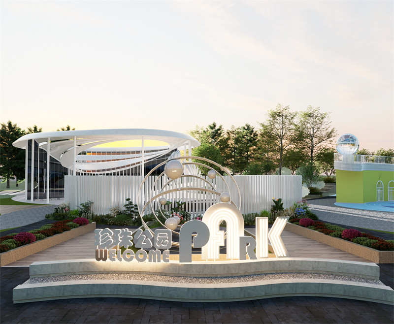 公园的主入口采用大气而又不失典雅的设计风格,以珍珠为设计元素,巧妙地融入门廊、灯景。