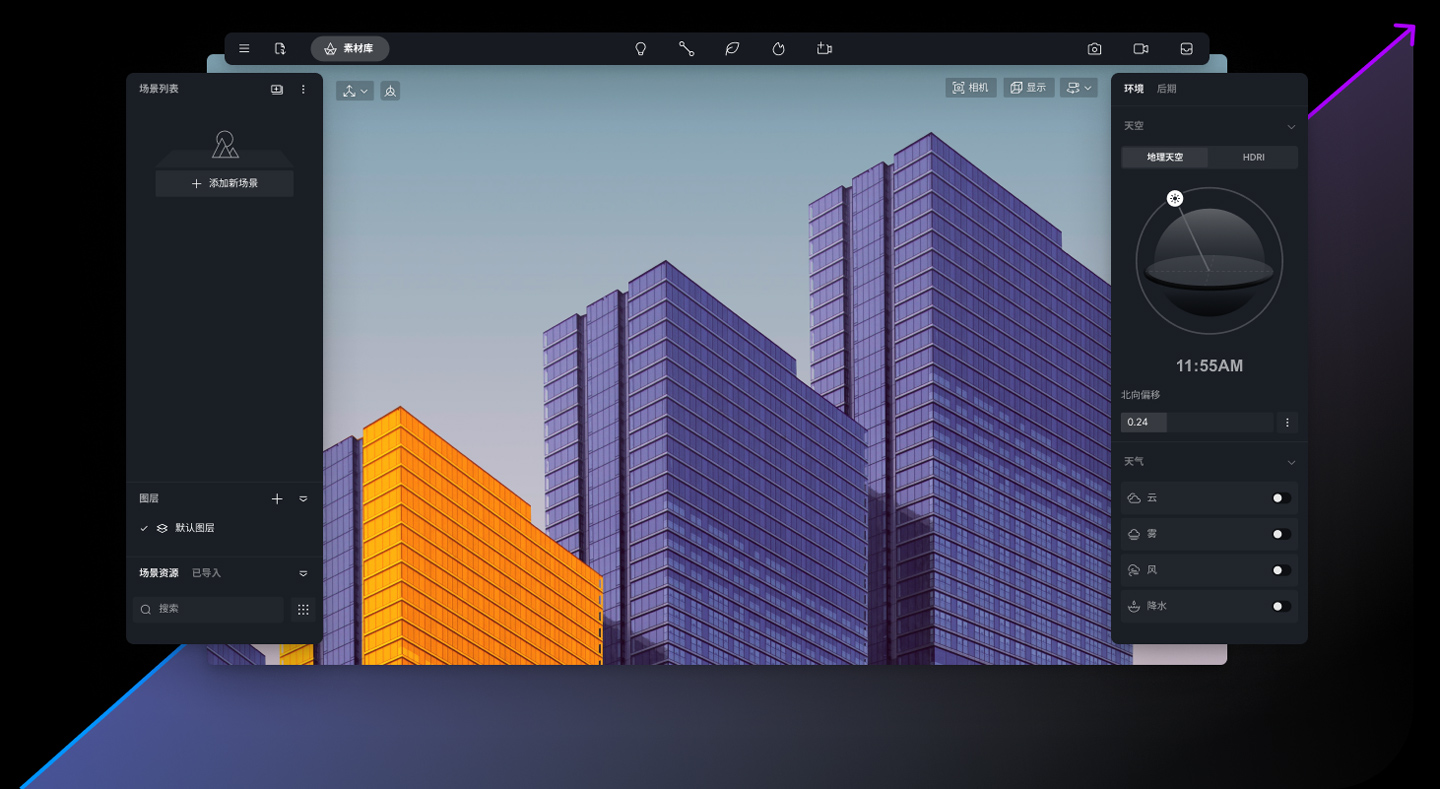 地理天空和天气系统,材质灵活编辑与各类预设材质模板。