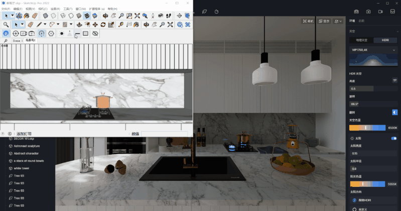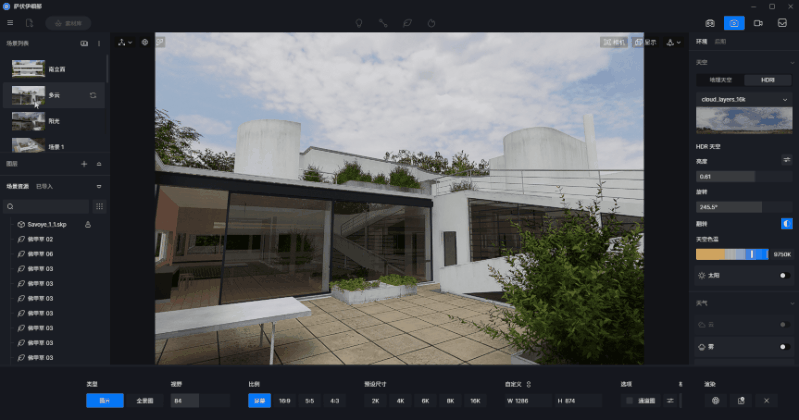 D5自带的素材库解决了以往植物等大模型需要载入SketchUp的问题,同时还有“景观专题”的行业主题素材包,设计师在D5中即可一站式地解决植物、构件等配景工作。
