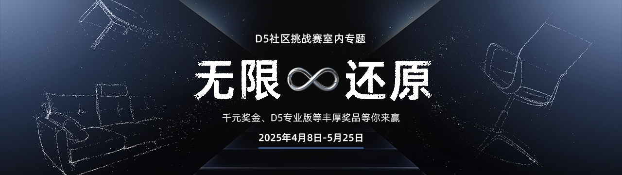 本次D5社区挑战赛,我们立足各类室内空间征集作品:你所设计的室内落地项目,或你临摹的经典室内空间案例——以D5为创作工具,以「无限∞还原」为命题,共赴实时渲染新旅程。
