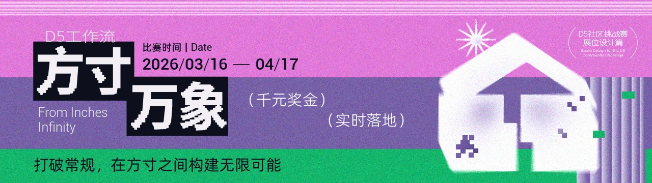本次D5社区挑战赛以「方寸·万象」为主题,将D5官方线下展位的形象设计权,交到每一位D5创作者手中。我们期待你打破常规,在方寸之间构建无限可能——让视觉发声,用空间叙事。