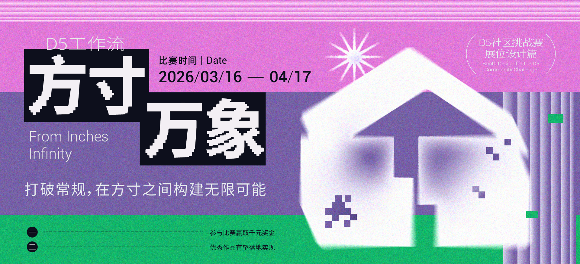 线下活动展位是品牌风格与产品体验的重要载体:在有限的物理空间内,通过视觉语言与动线设计,引导访客步入一场沉浸式的品牌旅程。本次D5社区挑战赛以「方寸·万象」为主题,将D5官方线下展位的形象设计权,交到每一位D5创作者手中。我们期待你打破常规,在方寸之间构建无限可能——让视觉发声,用空间叙事。