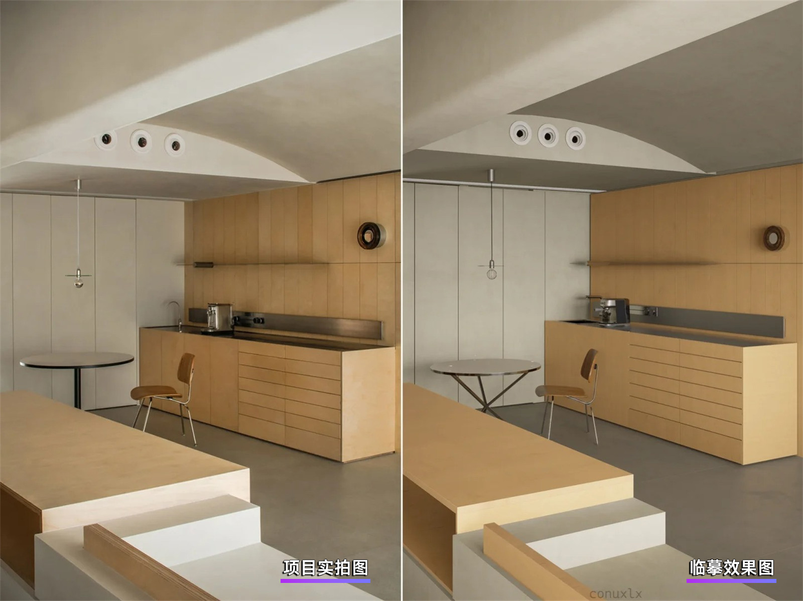 - 同一已竣工室内项目中,视角相对应的D5效果图与项目实景图;