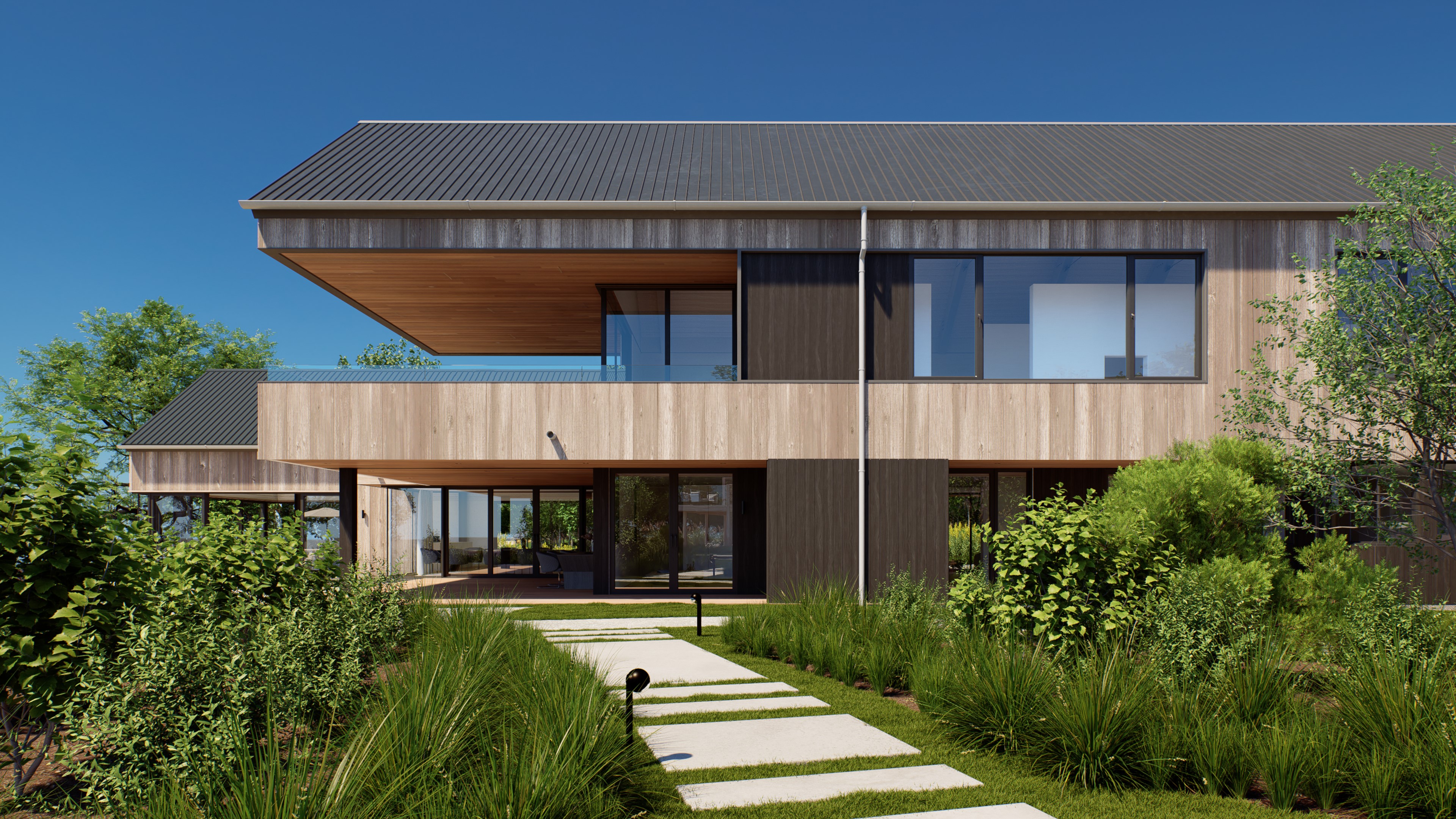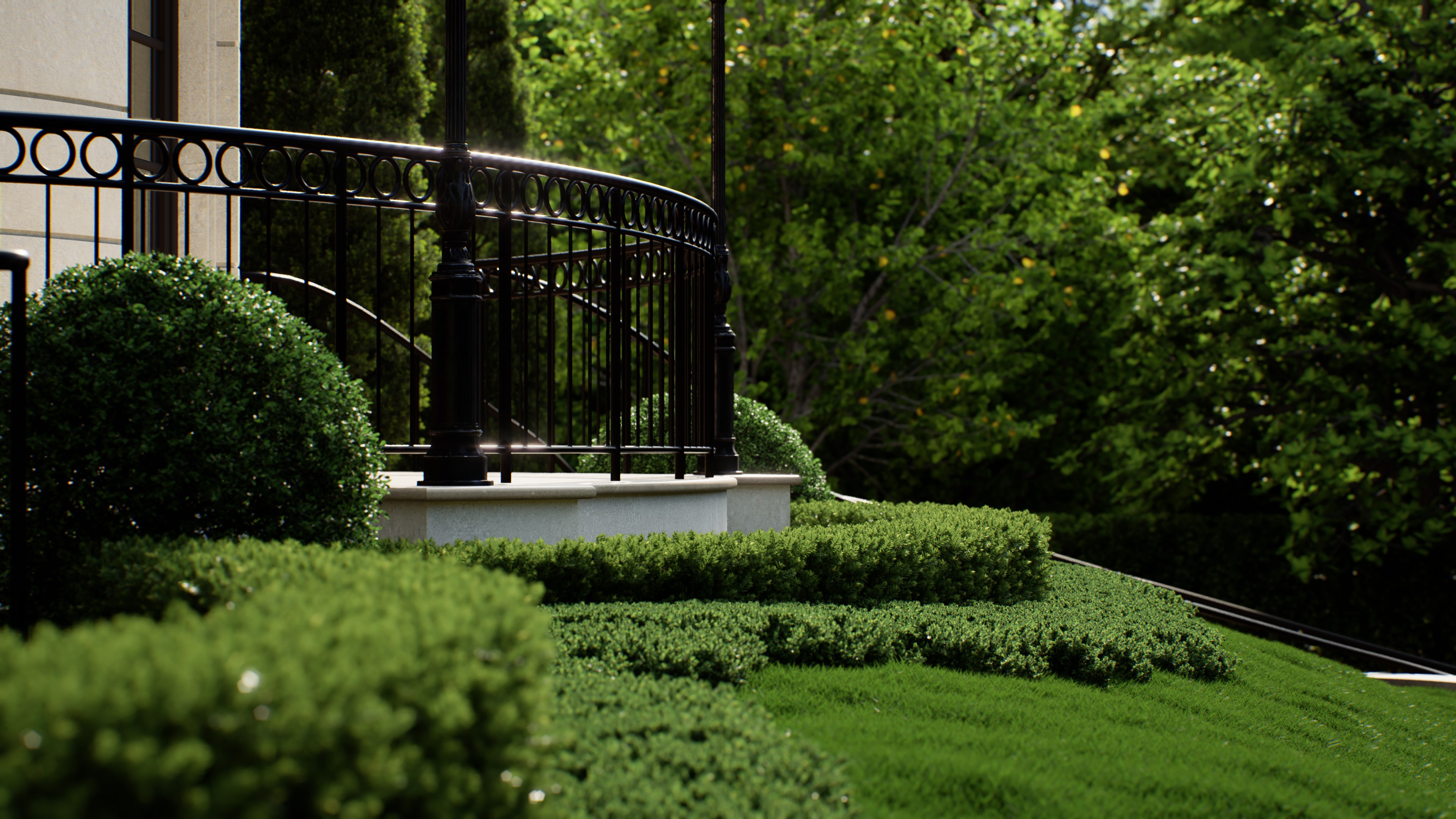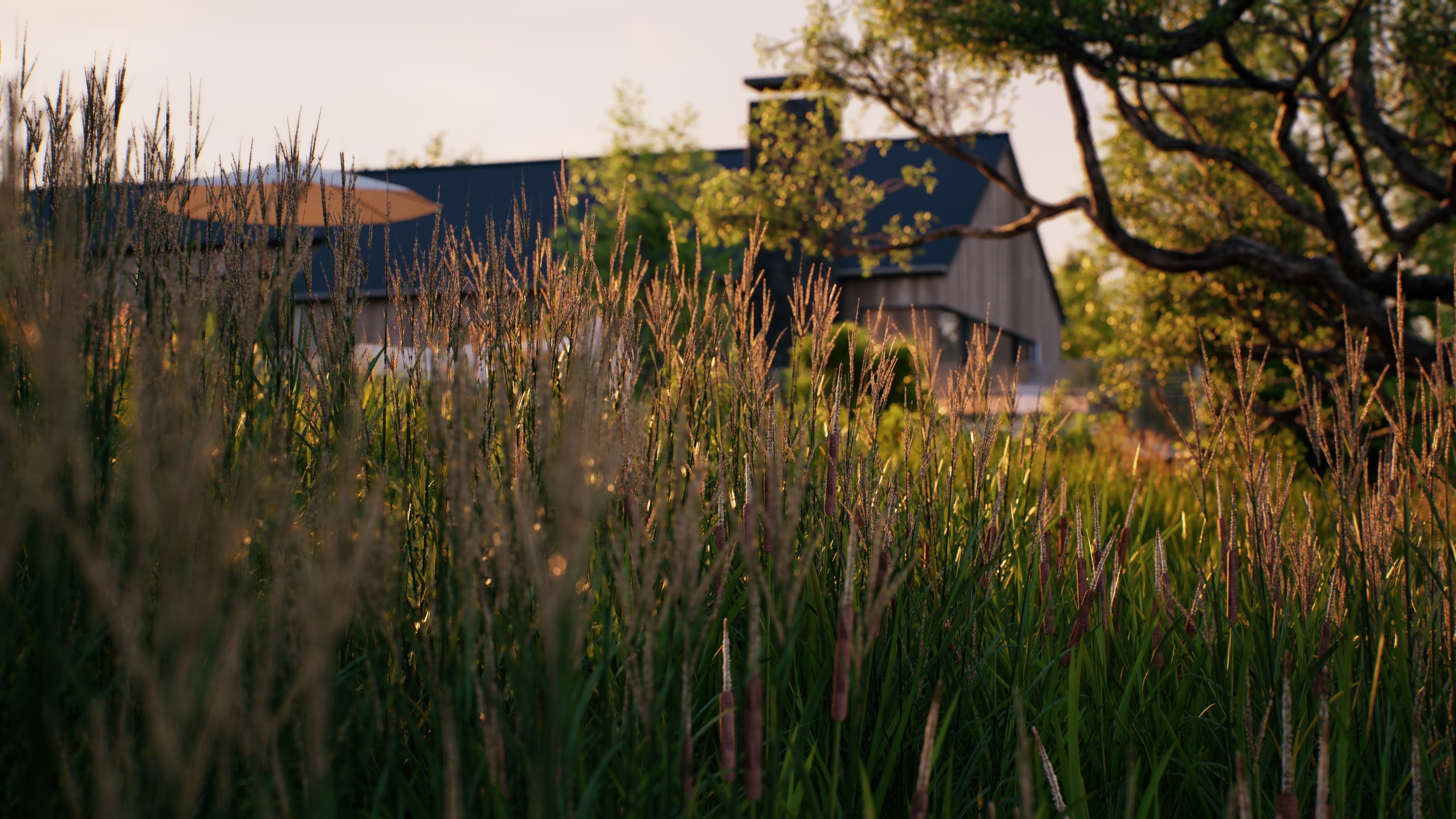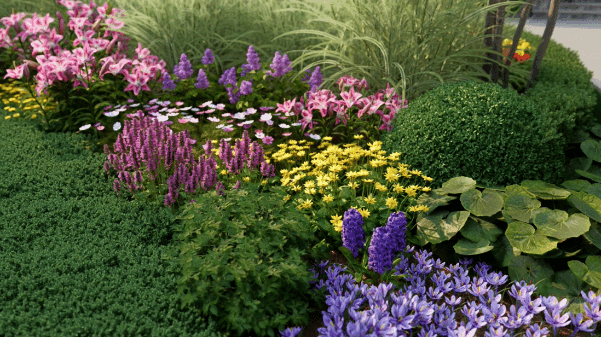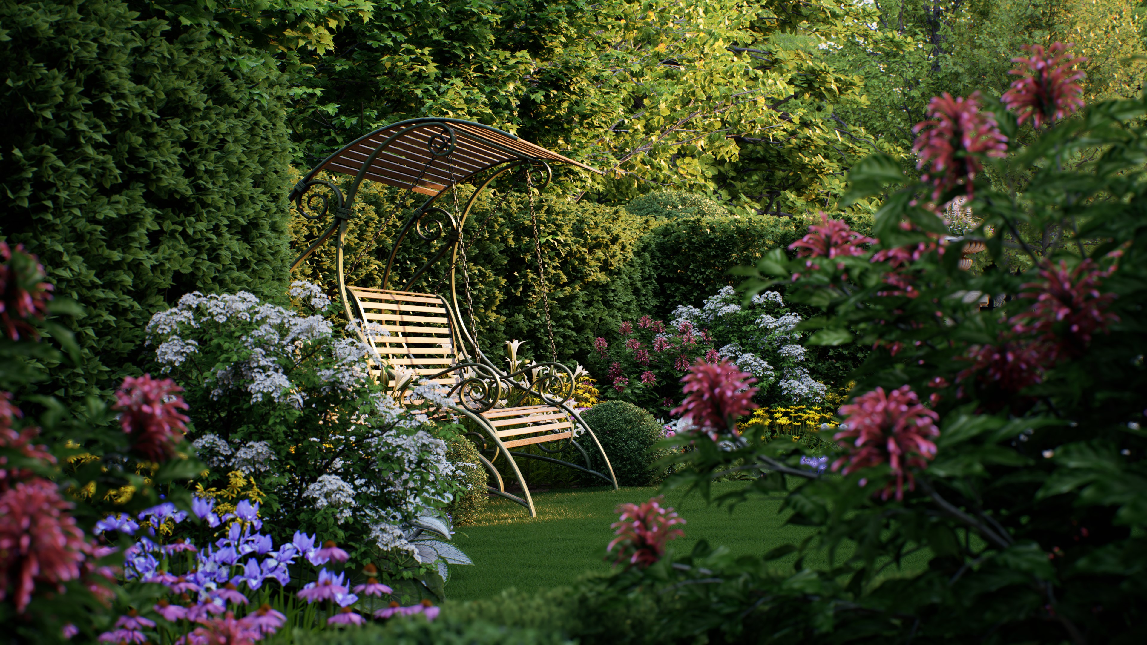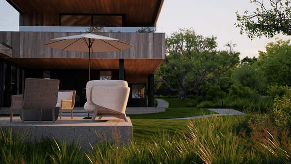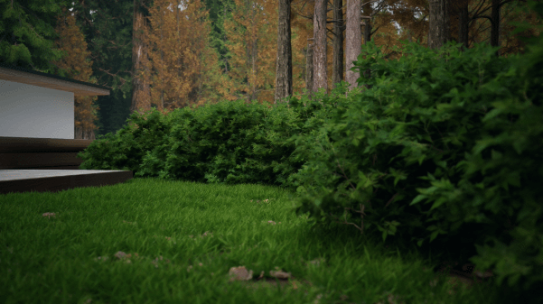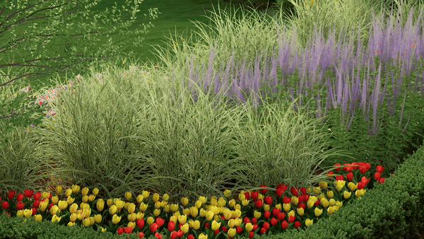通过D5“自定义组合”功能,可以将各类植物自由组合,搭配色彩,存为可便捷复用的植物组团,提高布景效率的同时,进一步提升场景表现力。