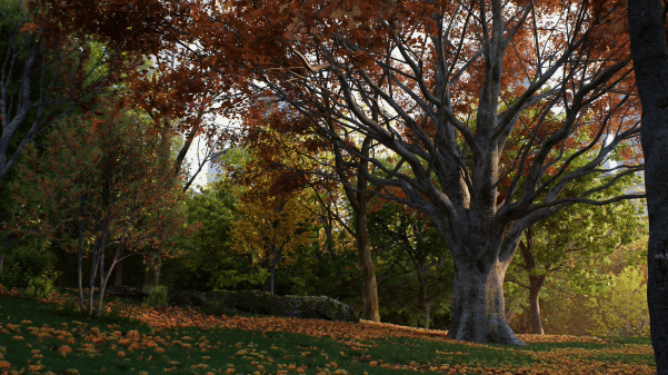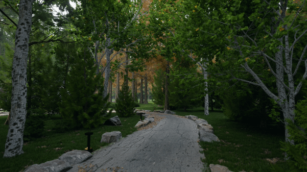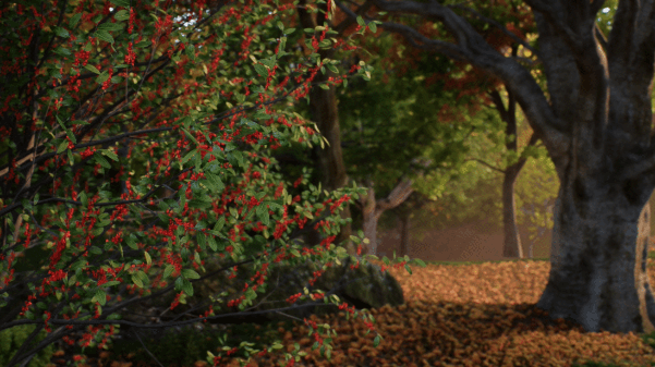 另外, D5制作了多棵同一品种,不同叶片颜色的树木可供选择。你也可以选中树叶材质,自行调整颜色,配合晴、雨、雪、雾等天气效果,体现四季变化,或创作独特的艺术效果。