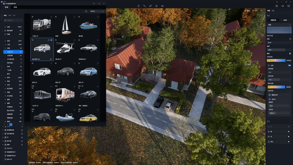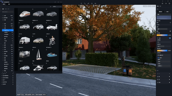 在道路边摆放适合的场景小品模型,从素材库中选择摆件、户外座椅、景观灯、车辆等,为场景增色添彩。