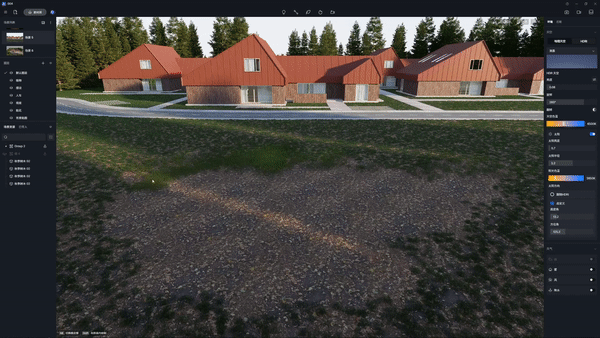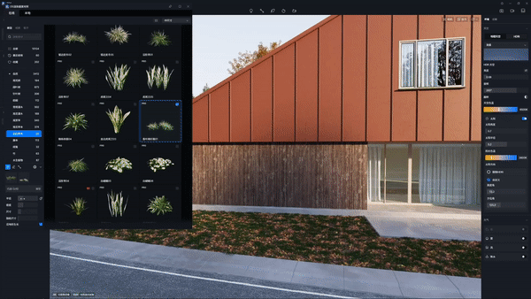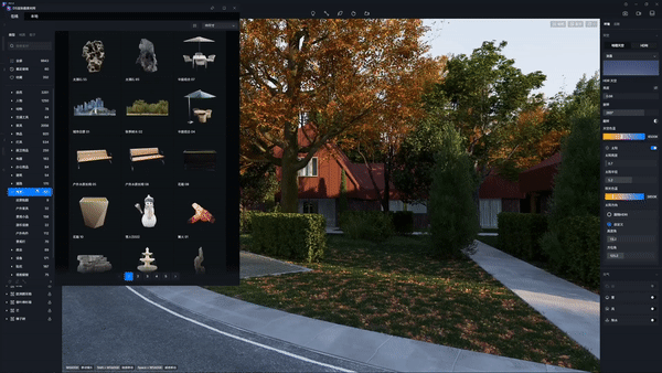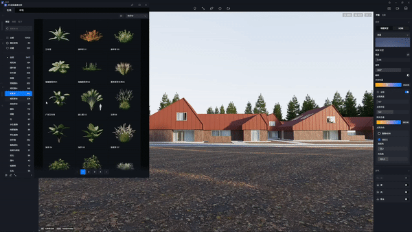 使用D5素材库内丰富的植物素材,包含动态植物、绿篱、组团植物等,直接拖出来放置,高效完成景观搭配与场景布置。