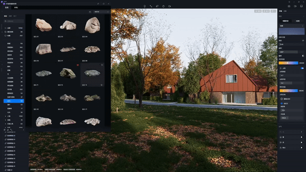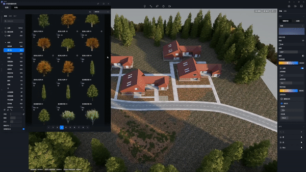 D5内提供了17种不同低模树,在处理大场景下的布景时,可以有效降低场景开销,提升操作流畅。