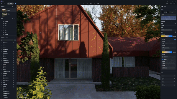 使用素材库中的视差橱窗直接填充室内场景,支持调节整体亮度、色温等参数,省去室内布置时间。