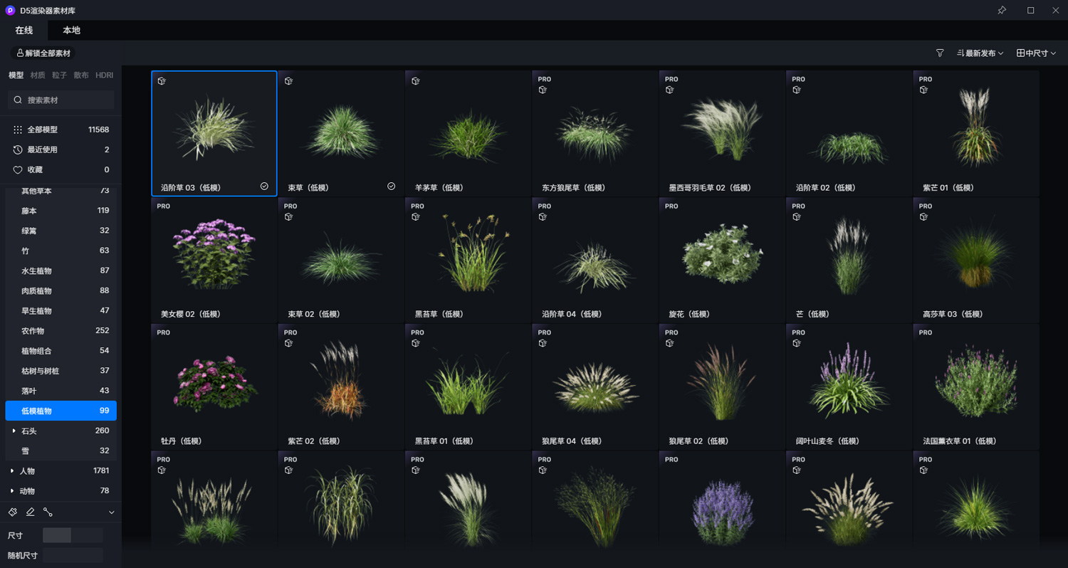 62 个以草本为主的低模植物已上架D5素材库,包括沿阶草、芒草等常用的散布地被植物。
