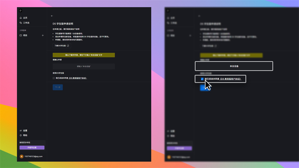 - D5学生版仅支持 1 台设备使用,申请后将不支持变更设备;