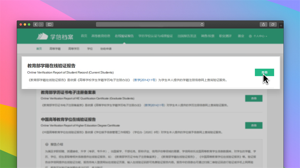 登录后点击顶部「在线验证报告」→ 选择「教育部学籍在线验证报告」→ 点击「查看」。
