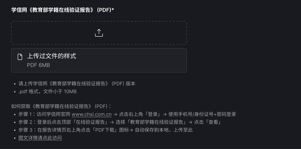 同时上传认证所需的 PDF 文件:学信网「教育部学籍在线验证报告」。