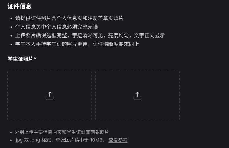 除了填写基础信息,认证流程中需提交两项认证材料:学生证照片*2、学信网「教育部学籍在线验证报告」( PDF 版本)*1。